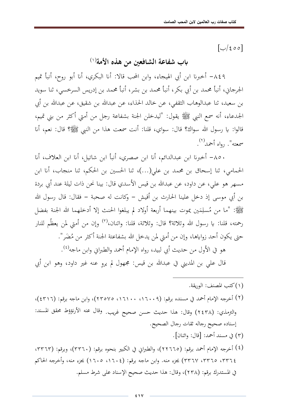 ٨٤٩ - أخبرنا ابن أبي الهيجاء، وابن المحب قالا: أنا البكري، أنا أبو روح، أنبأ تميم الجرجاني، أنبأ محمد بن أبي بكر، أنبأ محمد بن بشر، أنبأ محمد بن إدريس السرخسي، ثنا سويد بن سعيد، ثنا عبد الوهاب الثقفي، عن خالد الحذاء، عن عبد الله بن شقيق، عن عبد الله بن أبي الجدعاء، أنه سمع النبي -صلى الله عليه وسلم- يقول: "ليدخلن الجنة بشفاعة رجل من أمتي أكثر من بني تميم، قالوا: يا رسول الله سواك؟ قال: سواي، قلنا: أنت سمعت هذا من النبي -صلى الله عليه وسلم-؟ قال: نعم، أنا سمعته". رواه أحمد (¬٢).