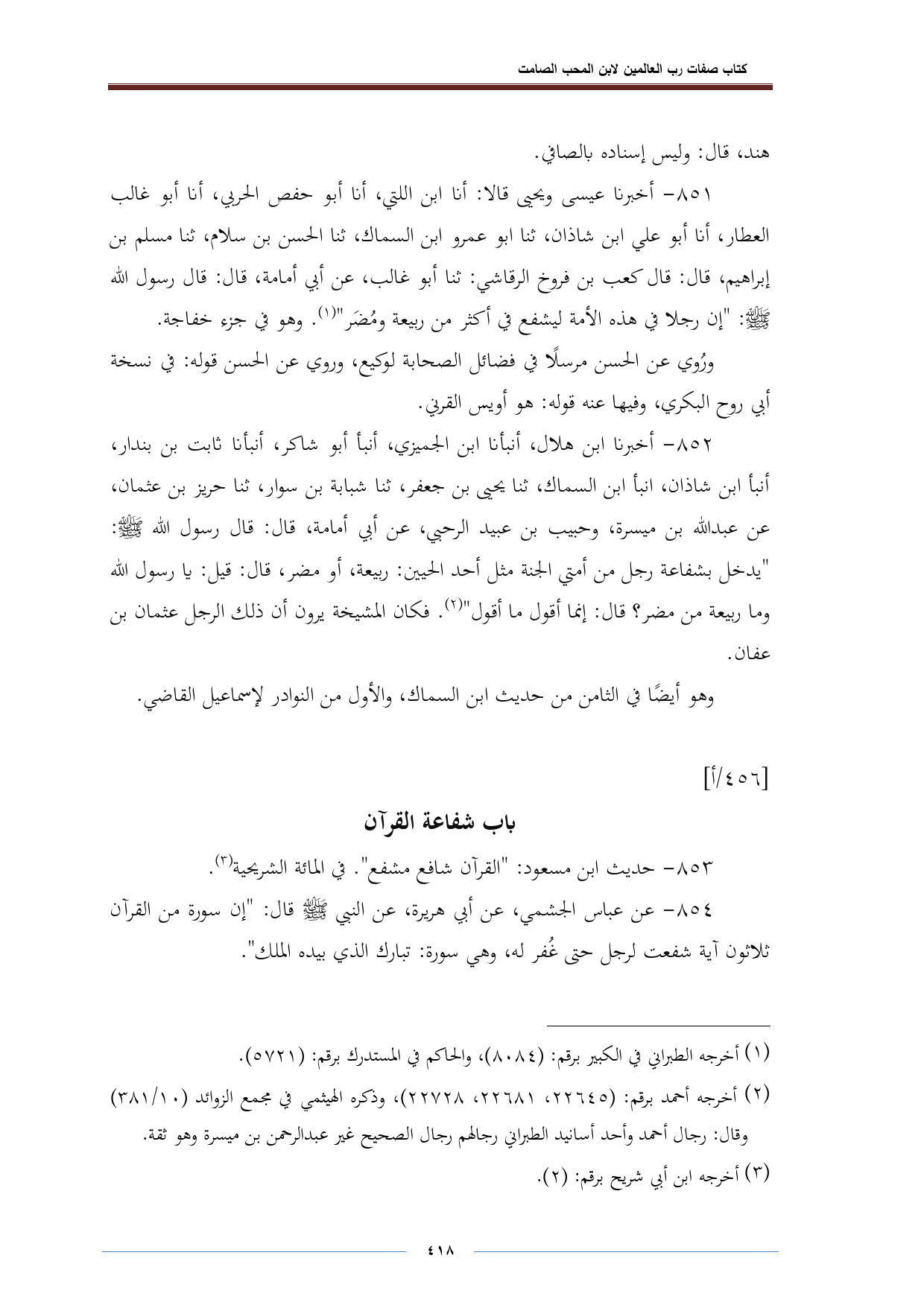 ٨٥٣ - حديث ابن مسعود: "القرآن شافع مشفع". في المائة الشريحية (¬٣).