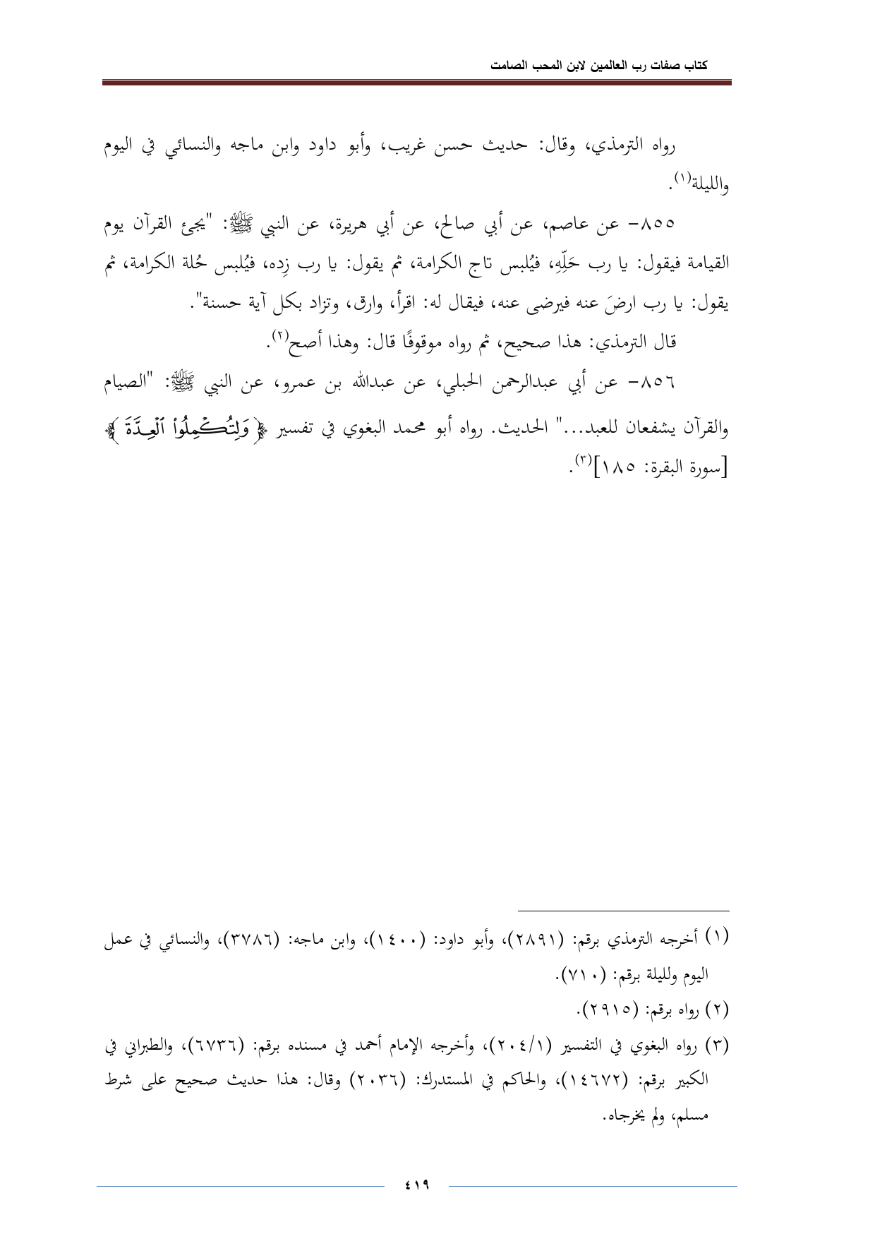 ٨٥٦ - عن أبي عبد الرحمن الحبلي، عن عبد الله بن عمرو، عن النبي -صلى الله عليه وسلم-: "الصيام والقرآن يشفعان للعبد ... " الحديث. رواه أبو محمد البغوي في تفسير {وَلِتُكْمِلُوا الْعِدَّةَ} [سورة البقرة: ١٨٥] (¬٣).