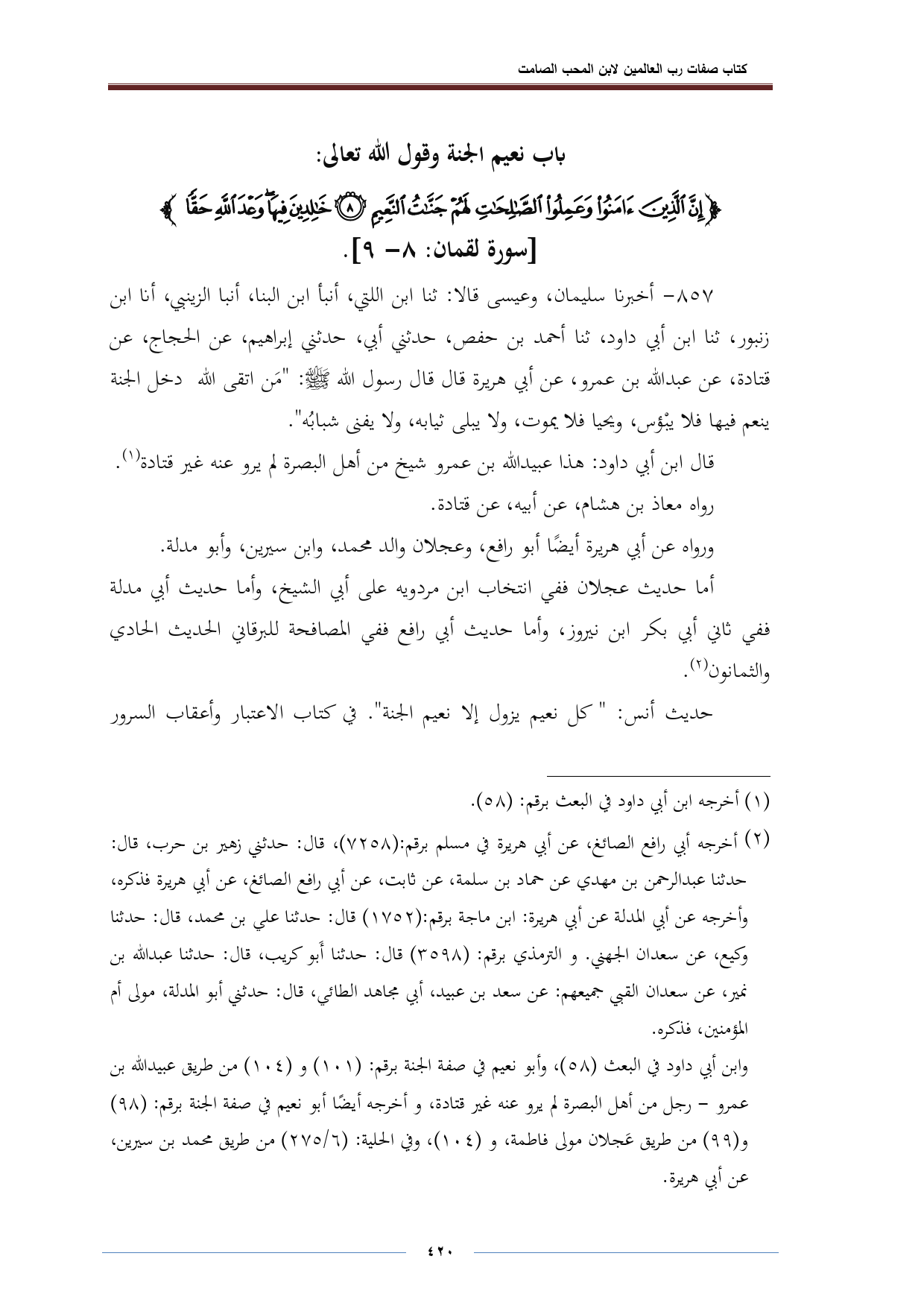 باب نعيم الجنة وقول الله تعالى: {إِنَّ الَّذِينَ آمَنُوا وَعَمِلُوا الصَّالِحَاتِ لَهُمْ جَنَّاتُ النَّعِيمِ (٨) خَالِدِينَ فِيهَا وَعْدَ اللَّهِ حَقًّا} [رسورة لقمان: ٨ - ٩].
