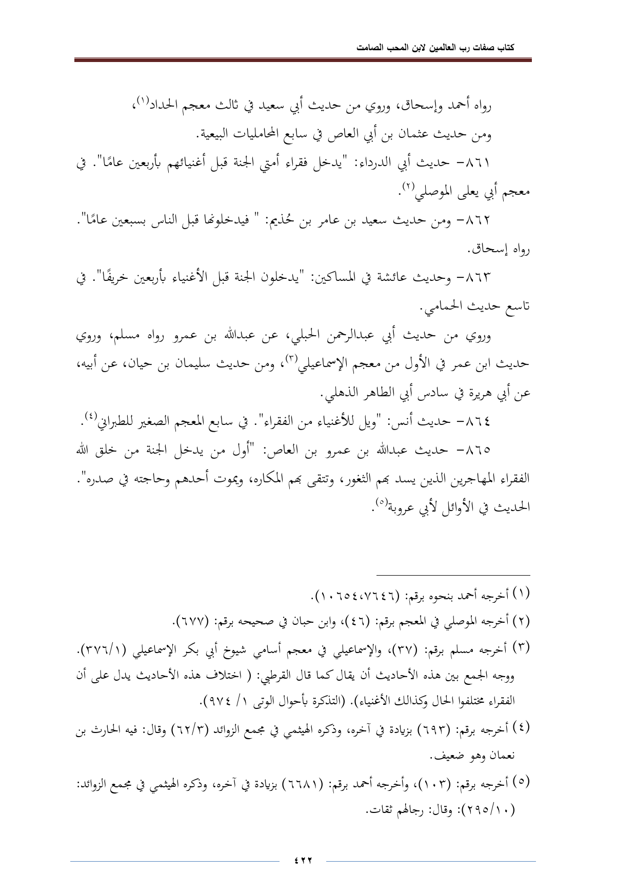 ٨٦١ - حديث أبي الدرداء: "يدخل فقراء أمتي الجنة قبل أغنيائهم بأربعين عامًا". في معجم أبي يعلى الموصلي (¬٢).
