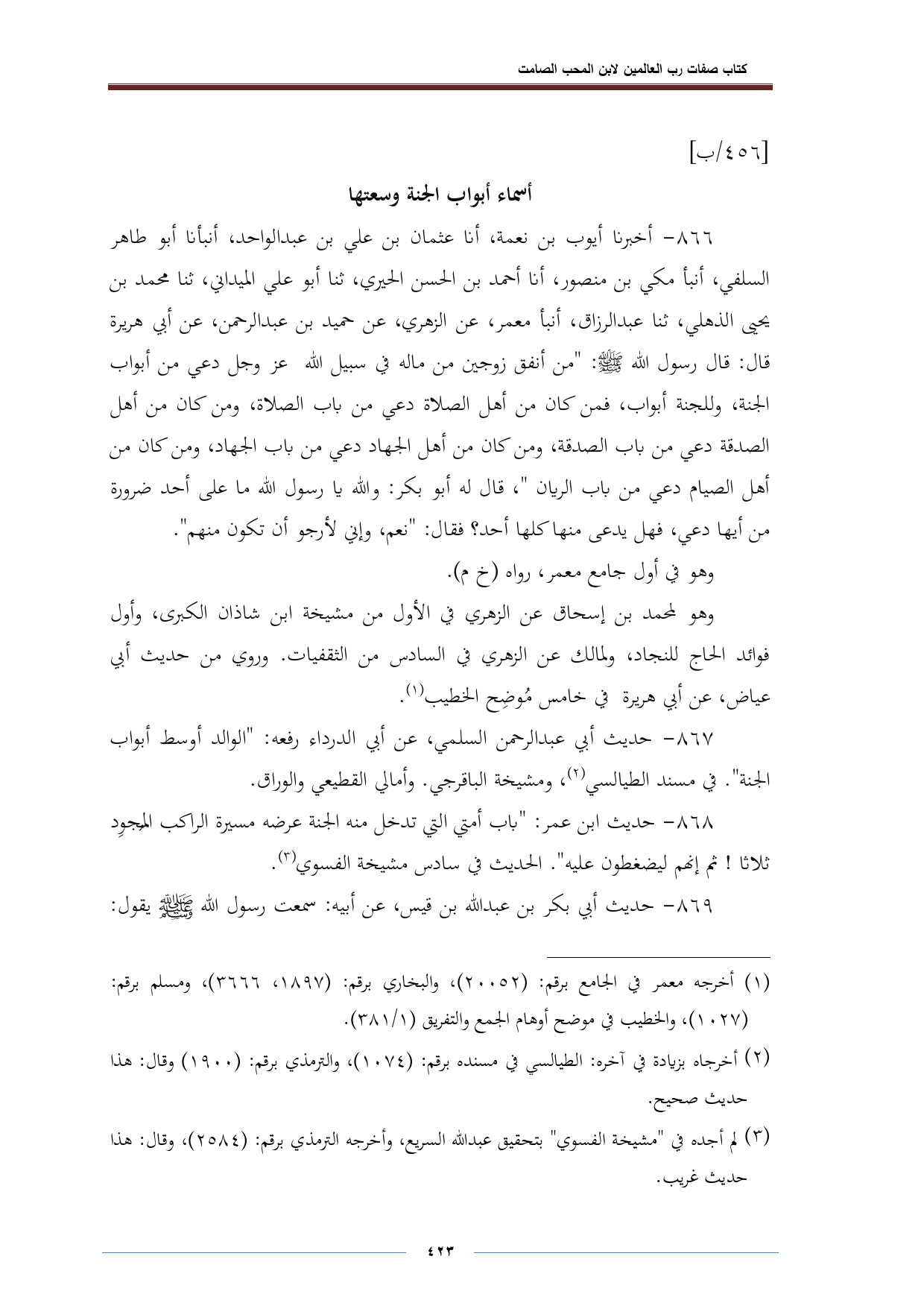 ٨٦٦ - أخبرنا أيوب بن نعمة، أنا عثمان بن علي بن عبد الواحد، أنبأنا أبو طاهر السلفي، أنبأ مكي بن منصور، أنا أحمد بن الحسن الحيري، ثنا أبو علي الميداني، ثنا محمد بن يحيى الذهلي، ثنا عبد الرزاق، أنبأ معمر، عن الزهري، عن حميد بن عبد الرحمن، عن أبي هريرة قال: قال رسول الله -صلى الله عليه وسلم-: "من أنفق زوجين من ماله في سبيل الله عز وجل دعي من أبواب الجنة، وللجنة أبواب، فمن كان من أهل الصلاة دعي من باب الصلاة، ومن كان من أهل الصدقة دعي من باب الصدقة، ومن كان من أهل الجهاد دعي من باب الجهاد، ومن كان من أهل الصيام دعي من باب الريان"، قال له أبو بكر: والله يا رسول الله ما على أحد ضرورة من أيها دعي، فهل يدعى منها كلها أحد؟ فقال: "نعم، وإني لأرجو أن تكون منهم".