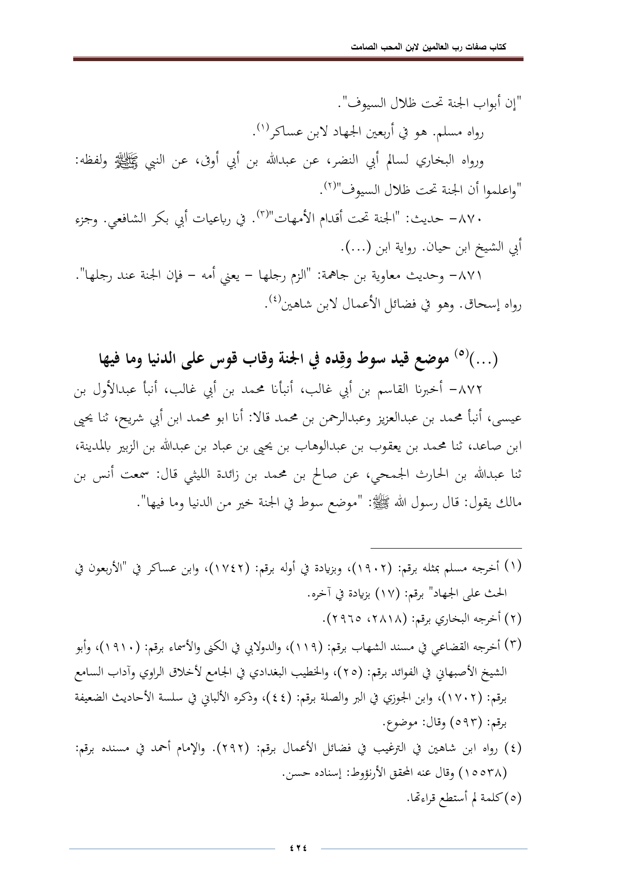 ٨٧٠ - حديث: "الجنة تحت أقدام الأمهات" (¬٣). في رباعيات أبي بكر الشافعي. وجزء أبي الشيخ ابن حيان. رواية ابن ( ... ).
