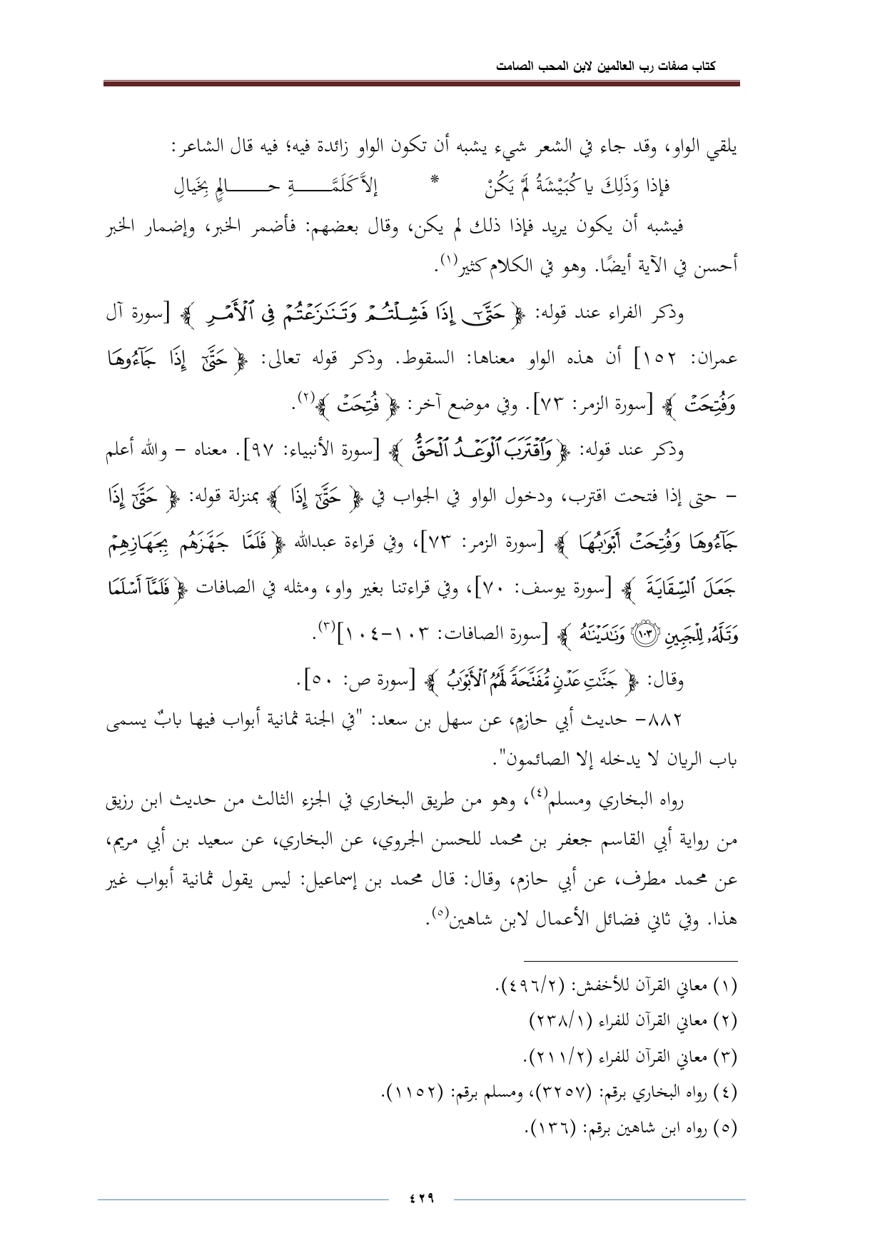 وذكر الفراء عند قوله: {حَتَّى إِذَا فَشِلْتُمْ وَتَنَازَعْتُمْ فِي الْأَمْرِ} [سورة آل عمران: ١٥٢] أن هذه الواو معناها: السقوط. وذكر قوله تعالى: {حَتَّى إِذَا جَاءُوهَا وَفُتِحَتْ} [سورة الزمر: ٧٣]. وفي موضع آخر: {فُتِحَتْ} (¬٢).