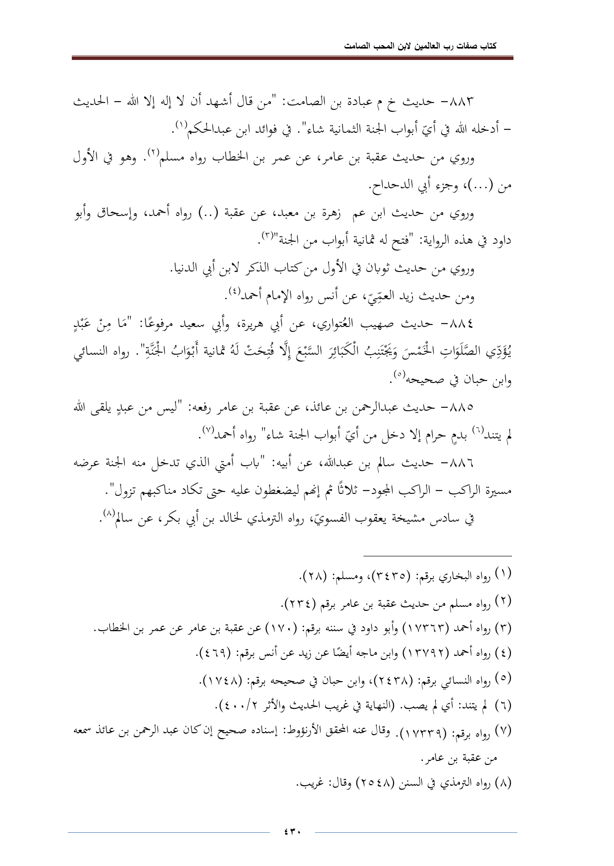 ٨٨٥ - حديث عبد الرحمن بن عائذ، عن عقبة بن عامر رفعه: "ليس من عبدٍ يلقى الله لم يتند (¬٦) بدمٍ حرام إلا دخل من أيّ أبواب الجنة شاء" رواه أحمد (¬٧).