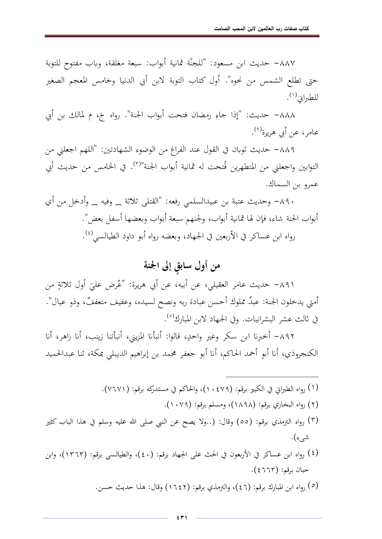 ٨٨٧ - حديث ابن مسعود: "للجنَّة ثمانية أبواب: سبعة مغلقة، وباب مفتوح للتوبة حتى تطلع الشمس من نحوه". أول كتاب التوبة لابن أبي الدنيا وخامس المعجم الصغير للطبراني (¬١).