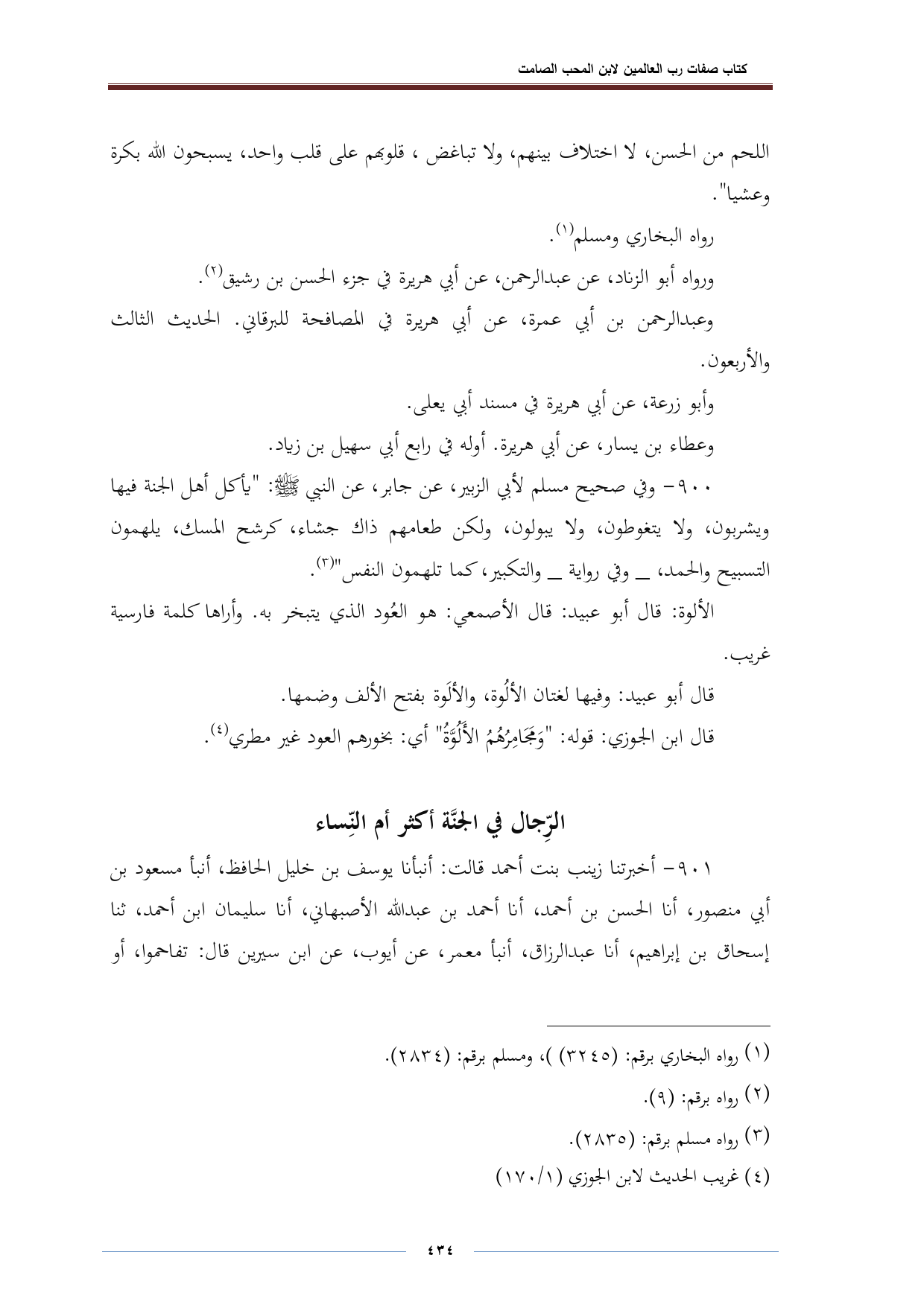 ٩٠٠ - وفي صحيح مسلم لأبي الزبير، عن جابر، عن النبي -صلى الله عليه وسلم-: "يأكل أهل الجنة فيها ويشربون، ولا يتغوطون، ولا يبولون، ولكن طعامهم ذاك جشاء، كرشع المسك، يلهمون التسبيح والحمد، -وفي رواية- والتكبير، كما تلهمون النفس" (¬٣).