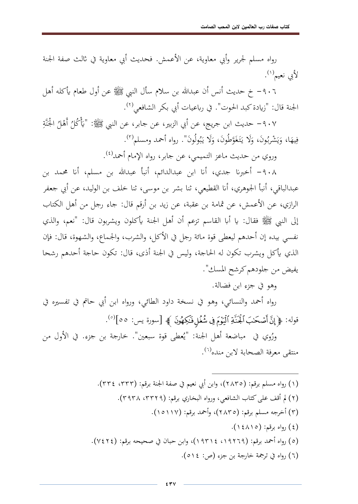 ٩٠٨ - أخبرنا جدي، أنا ابن عبد الدائم، أنبأ عبد الله بن مسلم، أنا محمد بن عبد الباقي، أنبأ الجوهري، أنا القطيعي، ثنا بشر بن موسى، ثنا خلف بن الوليد، عن أبي جعفر الرازي، عن الأعمش، عن ثمامة بن عقبة، عن زيد بن أرقم قال: جاء رجل من أهل الكتاب إلى النبي -صلى الله عليه وسلم- فقال: يا أبا القاسم تزعم أن أهل الجنة يأكلون ويشربون قال: "نعم، والذي نفسي بيده إن أحدهم ليعطى قوة مائة رجل في الأكل، والشرب، والجماع، والشهوة، قال: فإن الذي يأكل ويشرب تكون له الحاجة، وليس في الجنة أذى، قال: تكون حاجة أحدهم رشحا يفيض من جلودهم كرشح المسك ".