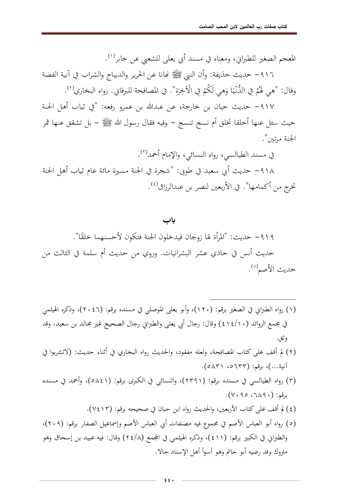 ٩١٨ - حديث أبي سعيد في طوبى: "شجرة في الجنة مسيرة مائة عام ثياب أهل الجنة تخرج من أكمامها". في الأربعين لنصر بن عبد الرزاق (¬٤).