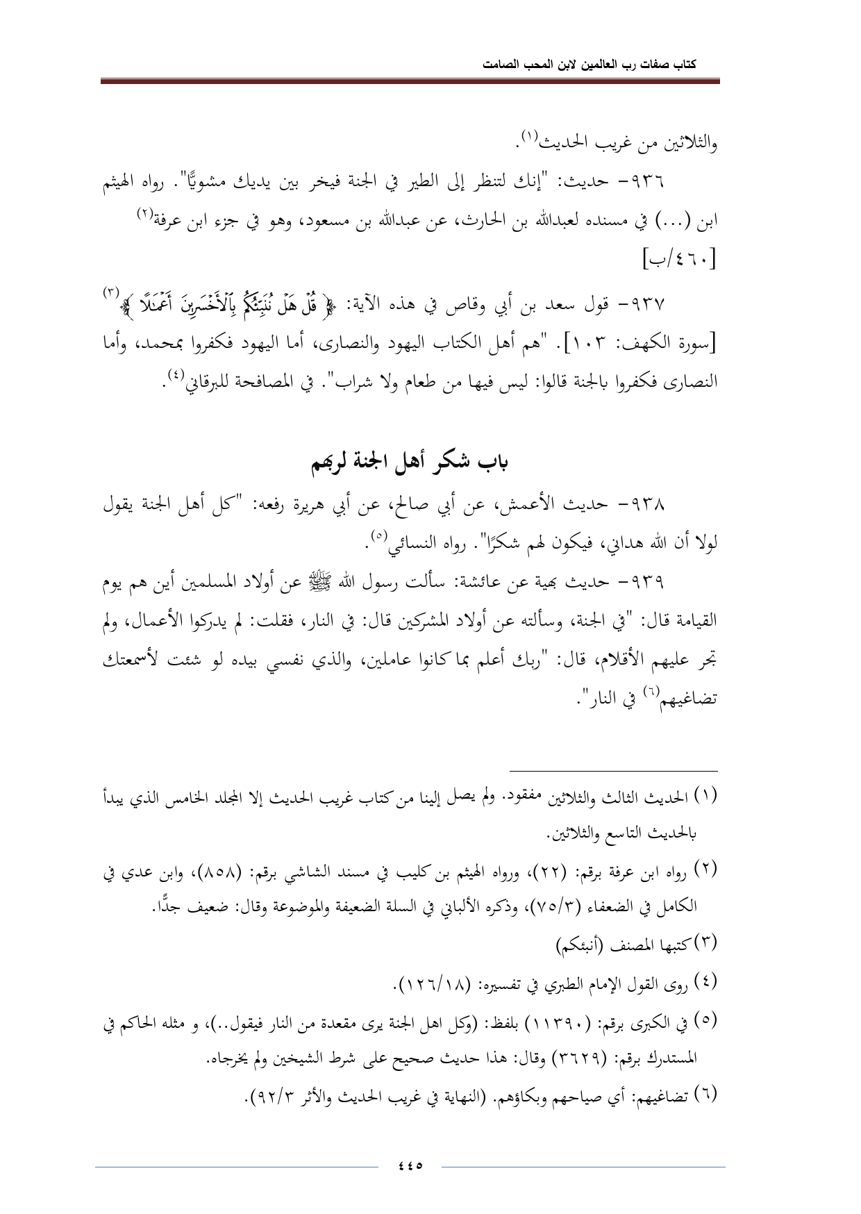 ٩٣٨ - حديث الأعمش، عن أبي صالح، عن أبي هريرة رفعه: "كل أهل الجنة يقول لولا أن الله هداني، فيكون لهم شكرًا". رواه النسائي (¬٥).