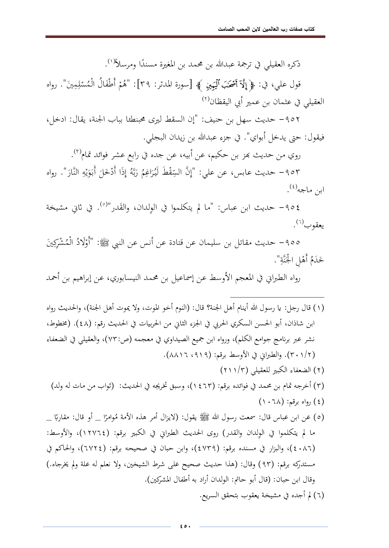 قول علي، في: {إِلَّا أَصْحَابَ الْيَمِينِ} [المدثر: ٣٩]: " هُمْ أَطْفَالُ الْمُسْلِمِينَ ". رواه العقيلي في عثمان بن عمير أبي اليقظان (¬٢)
