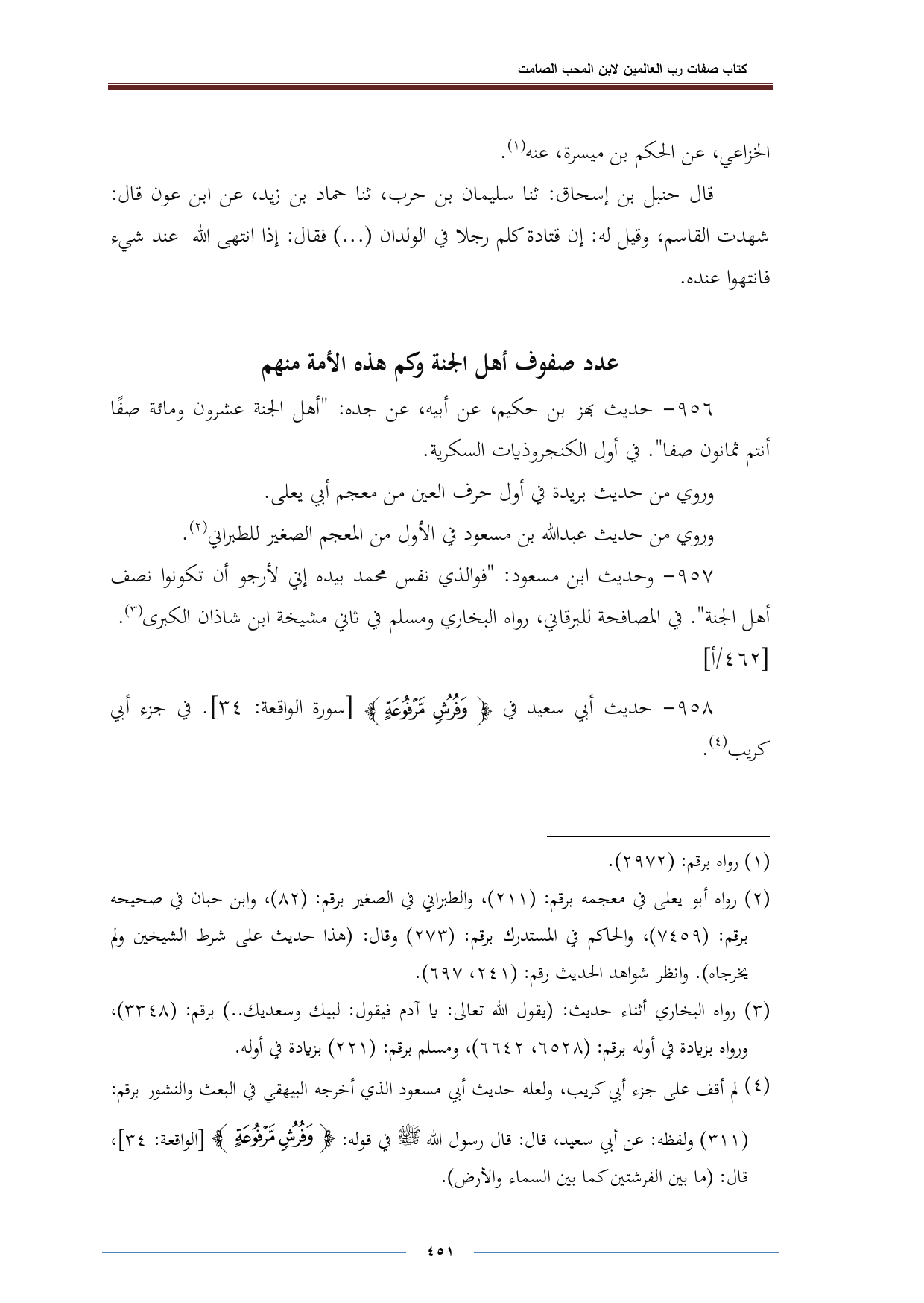 ٩٥٧ - وحديث ابن مسعود: " فوالذي نفس محمد بيده إني لأرجو أن تكونوا نصف أهل الجنة ". في المصافحة للبرقاني، رواه البخاري ومسلم في ثاني مشيخة ابن شاذان الكبرى (¬٣).