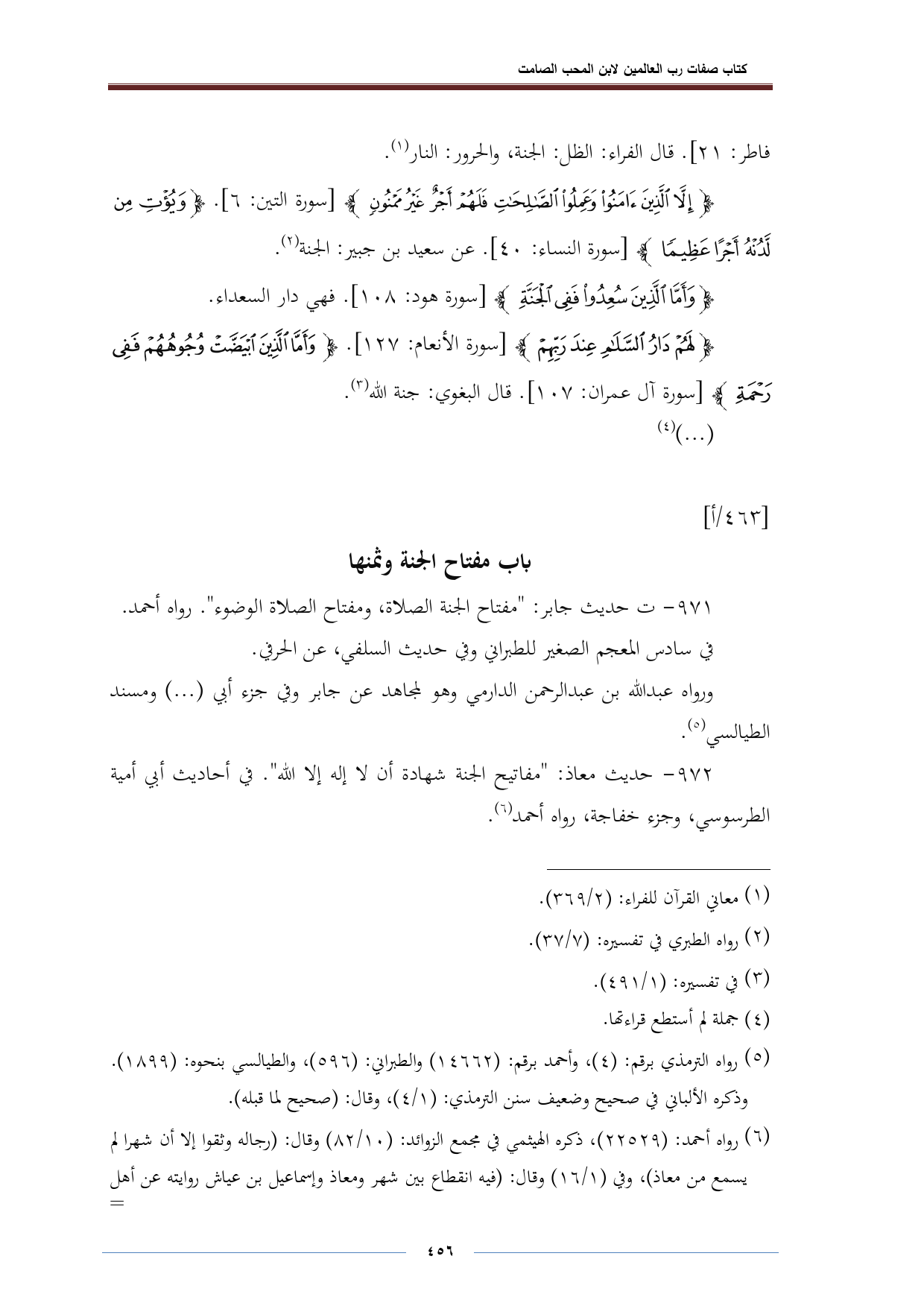 ٩٧١ - ت حديث جابر: " مفتاح الجنة الصلاة، ومفتاح الصلاة الوضوء ". رواه أحمد. في سادس المعجم الصغير للطبراني وفي حديث السلفي، عن الحرفي.