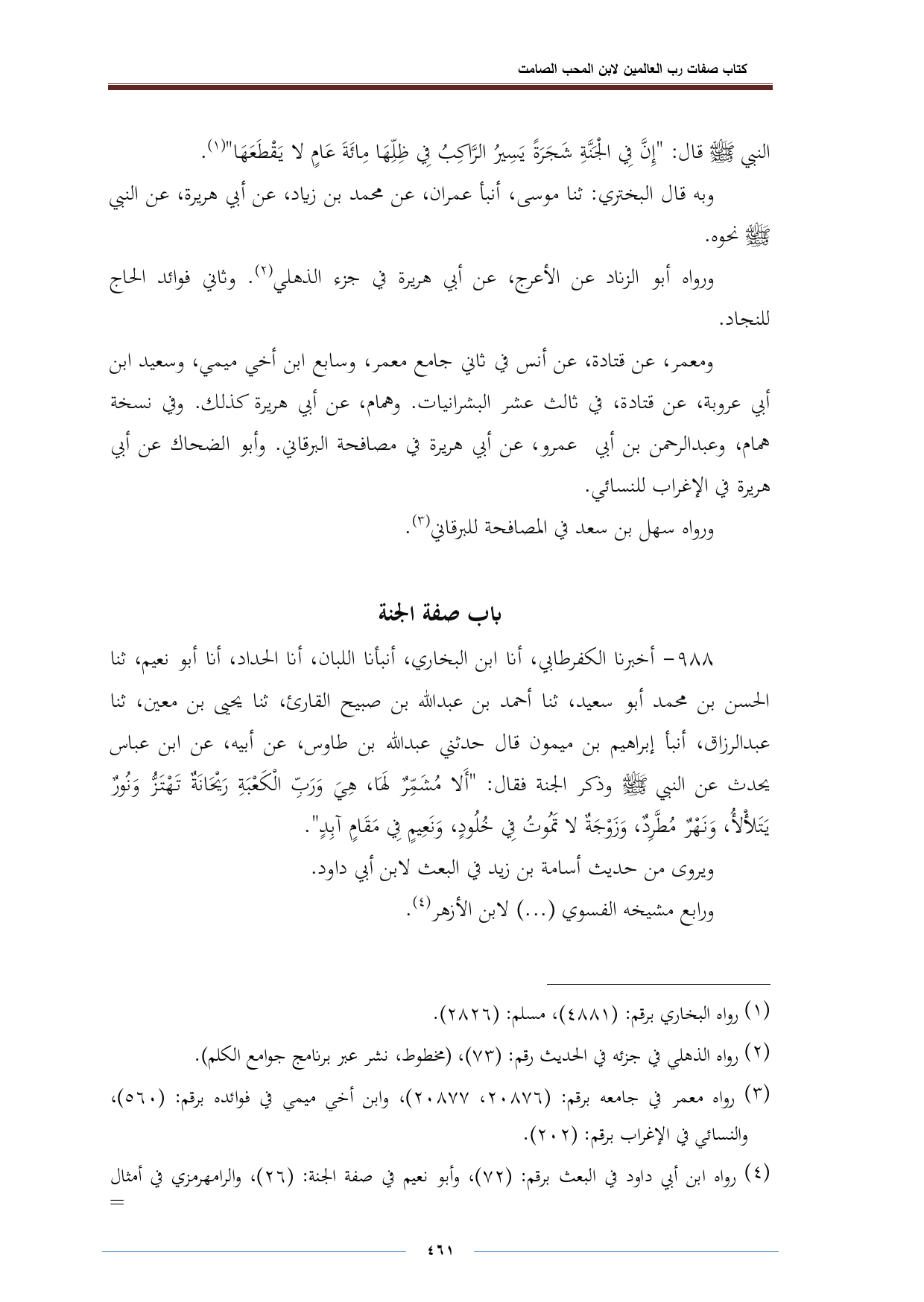 ٩٨٨ - أخبرنا الكفرطابي، أنا ابن البخاري، أنبأنا اللبان، أنا الحداد، أنا أبو نعيم، ثنا الحسن بن محمد أبو سعيد، ثنا أحمد بن عبد الله بن صبيح القارئ، ثنا يحيى بن معين، ثنا عبد الرزاق، أنبأ إبراهيم بن ميمون قال حدثني عبد الله بن طاوس، عن أبيه، عن ابن عباس يحدث عن النبي - صلى الله عليه وسلم - وذكر الجنة فقال: " أَلا مُشَمِّرٌ لَهَا، هِيَ وَرَبِّ الْكَعْبَةِ رَيْحَانَةٌ تَهْتَزُّ وَنُورٌ يَتَلأْلأُ، وَنَهْرٌ مُطَّرِدٌ، وَزَوْجَةٌ لا تَمُوتُ فِي خُلُودٍ، وَنَعِيمٍ فِي مَقَامٍ آبِدٍ ".