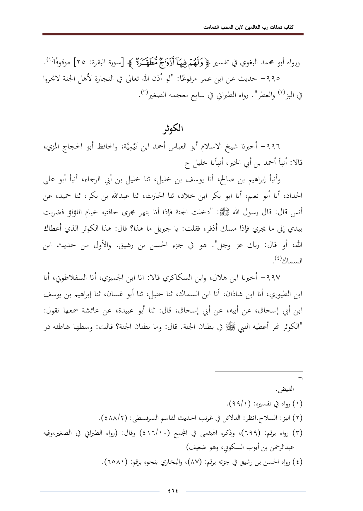 وأنبأ إبراهيم بن صالح، أنا يوسف بن خليل، ثنا خليل بن أبي الرجاء، أنبأ أبو علي الحداد، أنا أبو نعيم، أنا أبو بكر ابن خلاد، ثنا الحارث، ثنا عبد الله بن بكر، ثنا حميد، عن أنس قال: قال رسول الله - صلى الله عليه وسلم -: " دخلت الجنة فإذا أنا بنهر مجرى حافتيه خيام اللؤلؤ فضربت بيدي إلى ما يجري فإذا مسك أذفر، فقلت: يا جبريل ما هذا؟ قال: هذا الكوثر الذي أعطاك الله، أو قال: ربك عز وجل ". هو في جزء الحسن بن رشيق. والأول من حديث ابن السماك (¬٤).