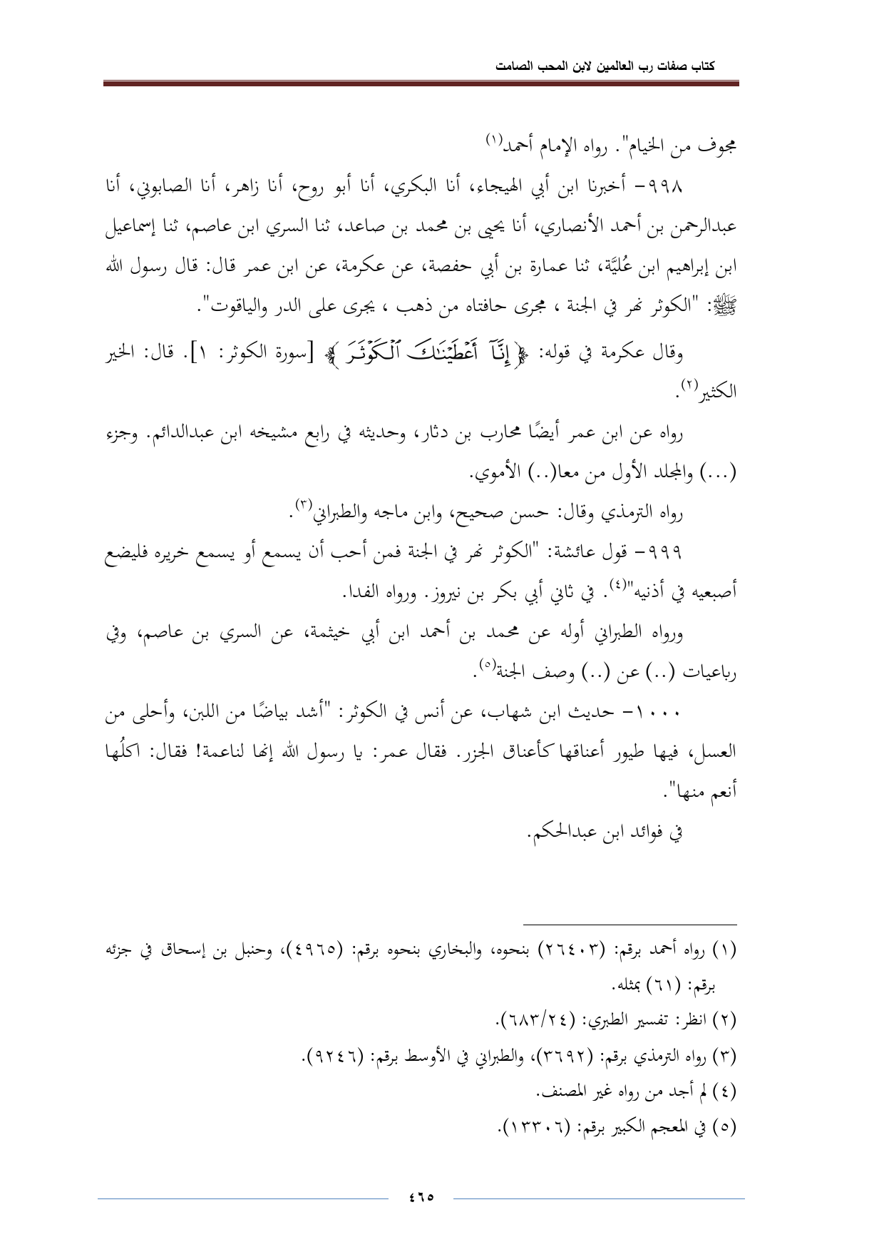 ٩٩٨ - أخبرنا ابن أبي الهيجاء، أنا البكري، أنا أبو روح، أنا زاهر، أنا الصابوني، أنا عبد الرحمن بن أحمد الأنصاري، أنا يحيى بن محمد بن صاعد، ثنا السري ابن عاصم، ثنا إسماعيل ابن إبراهيم ابن عُليَّة، ثنا عمارة بن أبي حفصة، عن عكرمة، عن ابن عمر قال: قال رسول الله - صلى الله عليه وسلم -: " الكوثر نهر في الجنة، مجرى حافتاه من ذهب، يجرى على الدر والياقوت ".