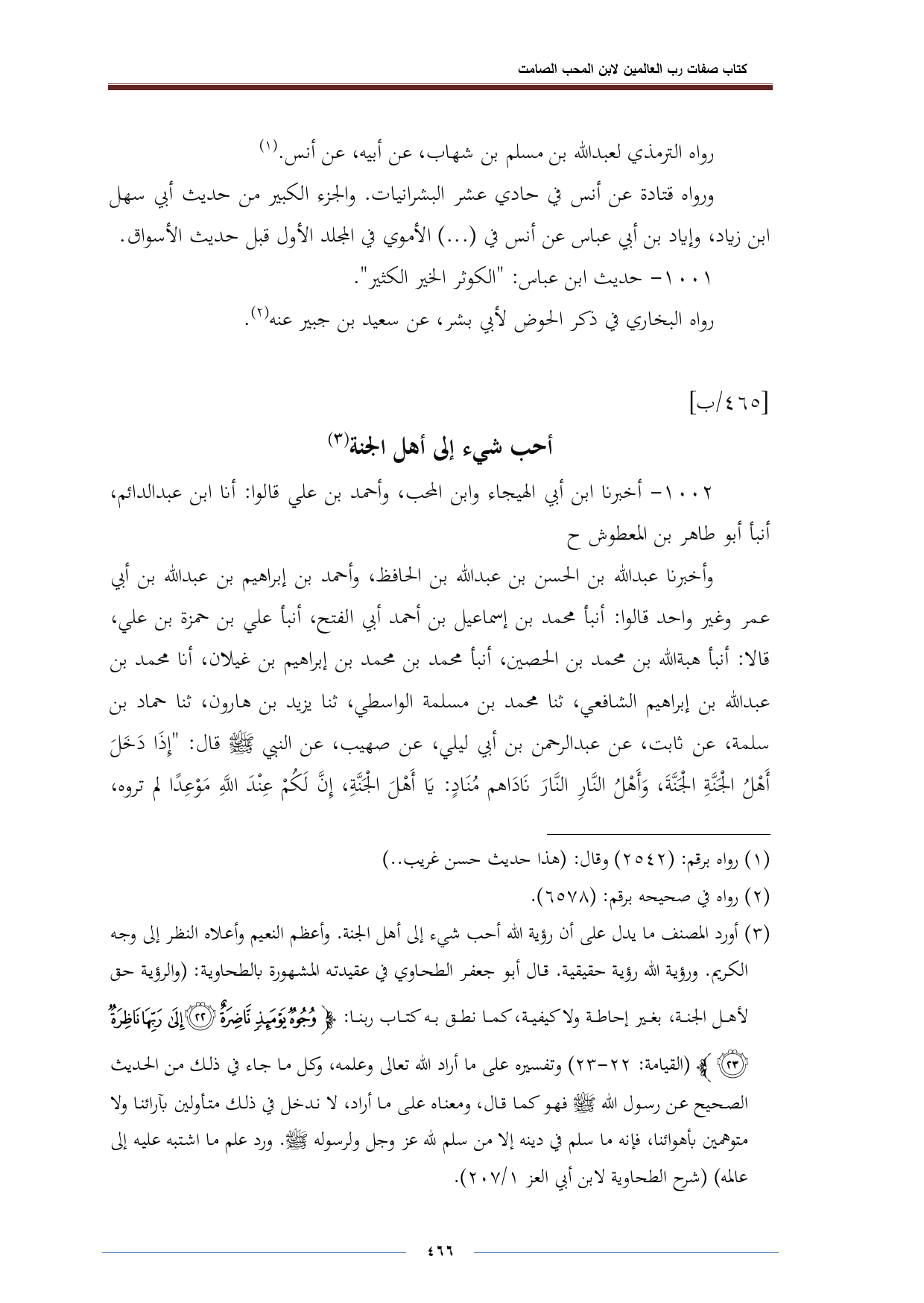 (¬٣) أورد المصنف ما يدل على أن رؤية الله أحب شيء إلى أهل الجنة. وأعظم النعيم وأعلاه النظر إلى وجه الكريم. ورؤية الله رؤية حقيقية. قال أبو جعفر الطحاوي في عقيدته المشهورة بالطحاوية: (والرؤية حق لأهل الجنة، بغير إحاطة ولا كيفية، كما نطق به كتاب ربنا: {وُجُوهٌ يَوْمَئِذٍ نَاضِرَةٌ (٢٢) إِلَى رَبِّهَا نَاظِرَةٌ (٢٣)} [القيامة: ٢٢، ٢٣] وتفسيره على ما أراد الله تعالى وعلمه، كل ما جاء في ذلك من الحديث الصحيح عن رسول الله - صلى الله عليه وسلم - فهو كما قال، ومعناه على ما أراد، لا ندخل في ذلك متأولين بآرائنا ولا متوهمين بأهوائنا، فإنه ما سلم في دينه إلا من سلم لله عز وجل ولرسوله - صلى الله عليه وسلم -. ورد علم ما اشتبه عليه إلى عالمه) (شرح الطحاوية لابن أبي العز ١/ ٢٠٧).