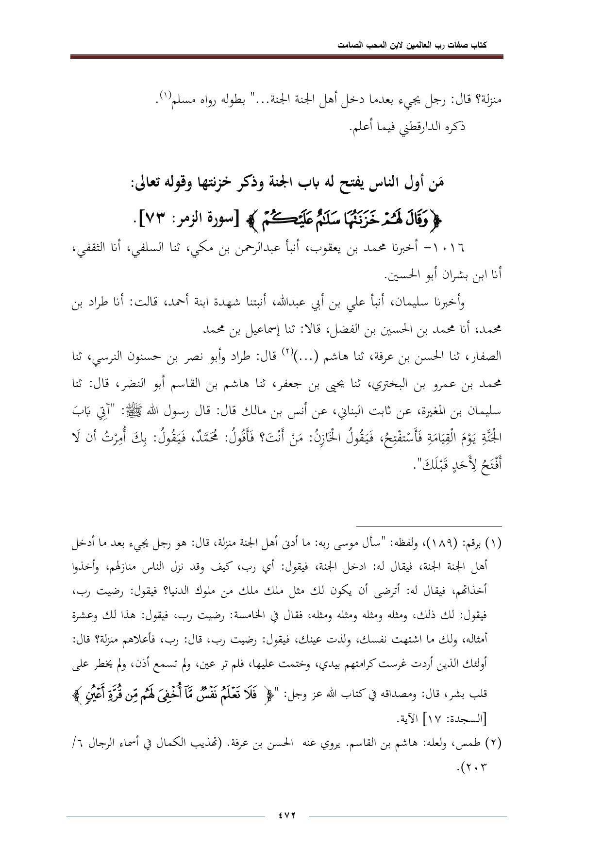 وأخبرنا سليمان، أنبأ علي بن أبي عبد الله، أنبتنا شهدة ابنة أحمد، قالت: أنا طراد بن محمد، أنا محمد بن الحسين بن الفضل، قالا: ثنا إسماعيل بن محمد الصفار، ثنا الحسن بن عرفة، ثنا هاشم ( ... ) (¬٢) قال: طراد وأبو نصر بن حسنون النرسي، ثنا محمد بن عمرو بن البختري، ثنا يحيى بن جعفر، ثنا هاشم بن القاسم أبو النضر، قال: ثنا سليمان بن المغيرة، عن ثابت البناني، عن أنس بن مالك قال: قال رسول الله - صلى الله عليه وسلم -: " آتِي بَابَ الْجَنَّةِ يَوْمَ الْقِيَامَةِ فَأَسْتفْتِحُ فَيَقُولُ الْخَازِنُ: مَنْ أَنْتَ؟ فَأَقُولُ: مُحَمَّدٌ، فَيَقُولُ: بِكَ أُمِرْتُ أن لَا أَفْتَحُ لِأَحَدٍ قَبْلَكَ ".