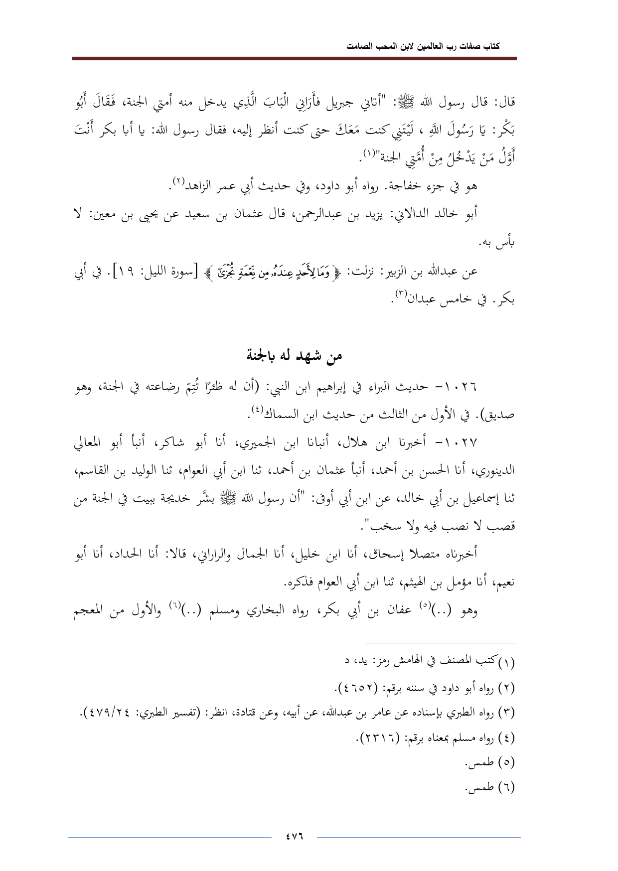 ١٠٢٦ - حديث البراء في إبراهيم ابن النبي: (أن له ظئرًا تُتِمّ رضاعته في الجنة، وهو صديق). في الأول من الثالث من حديث ابن السماك (¬٤).