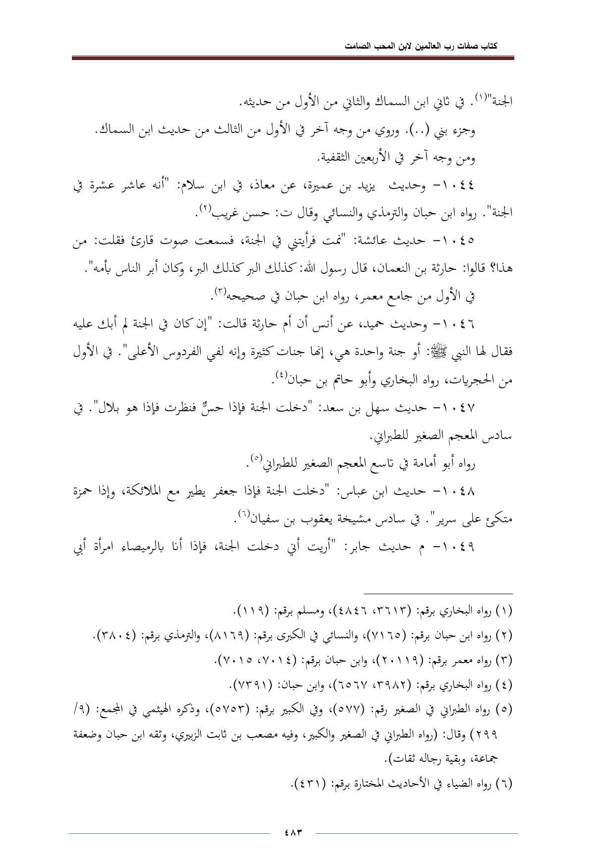 ١٠٤٦ - وحديث حميد، عن أنس أن أم حارثة قالت: " إن كان في الجنة لم أبك عليه فقال لها النبي - صلى الله عليه وسلم -: أو جنة واحدة هي، إنها جنات كثيرة وإنه لفي الفردوس الأعلى ". في الأول من الحجريات، رواه البخاري وأبو حاتم بن حبان (¬٤).