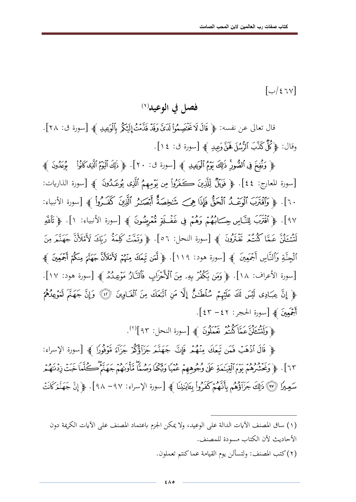 (¬١) ساق المصنف الآيات الدالة على الوعيد، ولا يمكن الجزم باعتماد المصنف على الآيات الكريمة دون الأحاديث لأن الكتاب مسودة للمصنف.