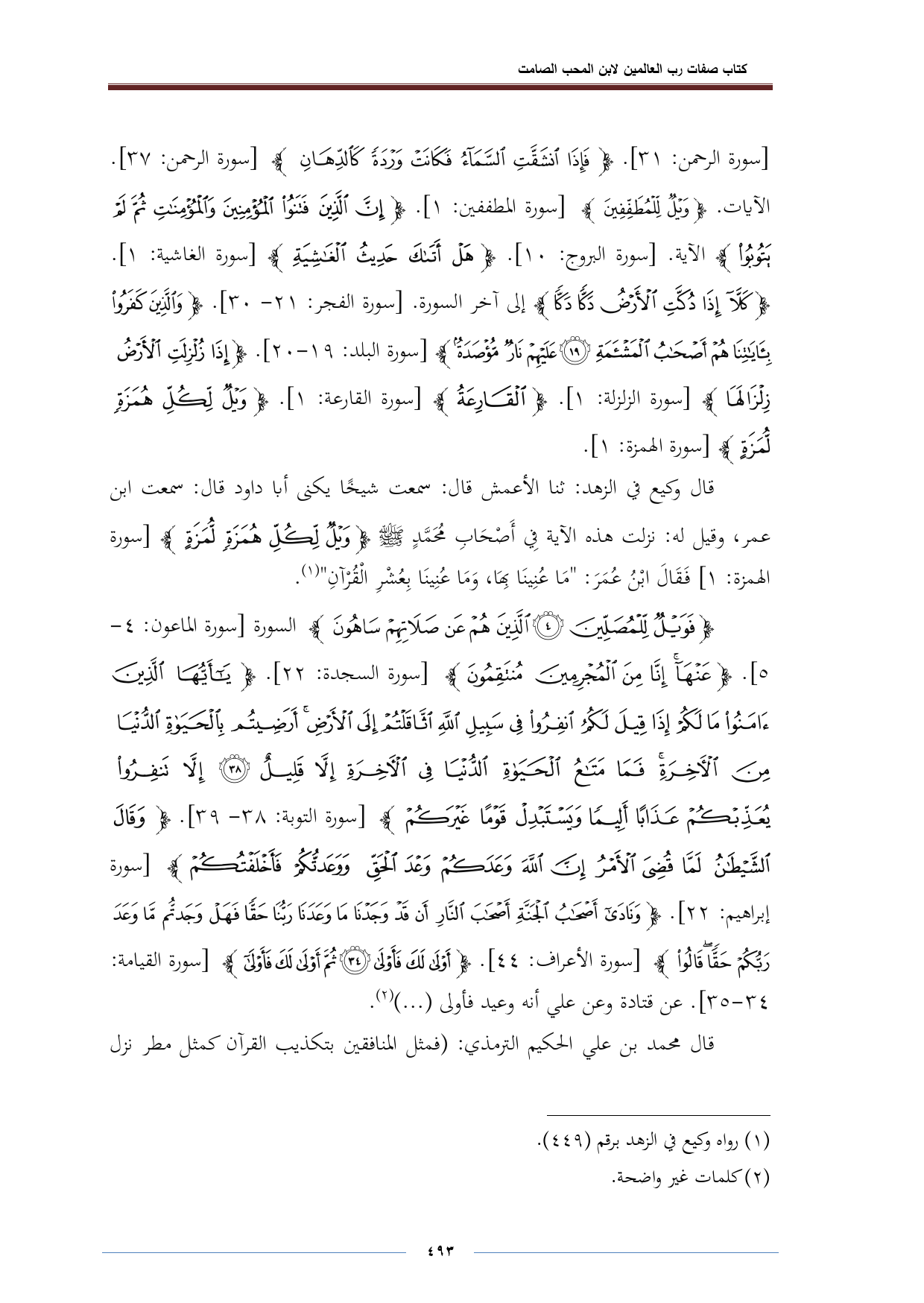 [سورة الرحمن: ٣١]. {فَإِذَا انْشَقَّتِ السَّمَاءُ فَكَانَتْ وَرْدَةً كَالدِّهَانِ} [سورة الرحمن: ٣٧]. الآيات. {وَيْلٌ لِلْمُطَفِّفِينَ} [سورة المطففين: ١]. {إِنَّ الَّذِينَ فَتَنُوا الْمُؤْمِنِينَ وَالْمُؤْمِنَاتِ ثُمَّ لَمْ يَتُوبُوا} الآية. [سورة البروج: ١٠]. {هَلْ أَتَاكَ حَدِيثُ الْغَاشِيَةِ} [سورة الغاشية: ١]. {كَلَّا إِذَا دُكَّتِ الْأَرْضُ دَكًّا دَكًّا} إلى آخر السورة. [سورة الفجر: ٢١ - ٣٠]. {وَالَّذِينَ كَفَرُوا بِآيَاتِنَا هُمْ أَصْحَابُ الْمَشْأَمَةِ (١٩) عَلَيْهِمْ نَارٌ مُؤْصَدَةٌ} [سورة البلد: ١٩ - ٢٠]. {إِذَا زُلْزِلَتِ الْأَرْضُ زِلْزَالَهَا} [سورة الزلزلة: ١]. {الْقَارِعَةُ} [سورة القارعة: ١]. {وَيْلٌ لِكُلِّ هُمَزَةٍ لُمَزَةٍ} [سورة الهمزة: ١].