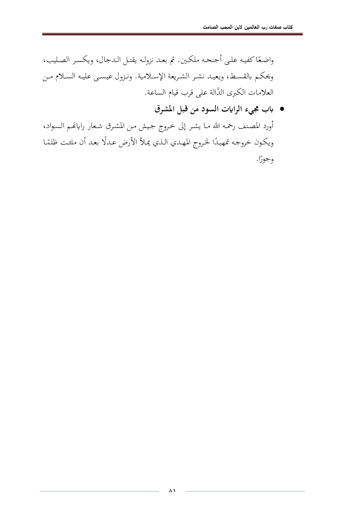 أورد المصنف رحمه الله ما يشر إلى خروج جيش من المشرق شعار راياتهم السواد، ويكون خروجه تمهيدًا لخروج المهدي الذي يملأ الأرض عدلًا بعد أن ملئت ظلمًا وجورًا.