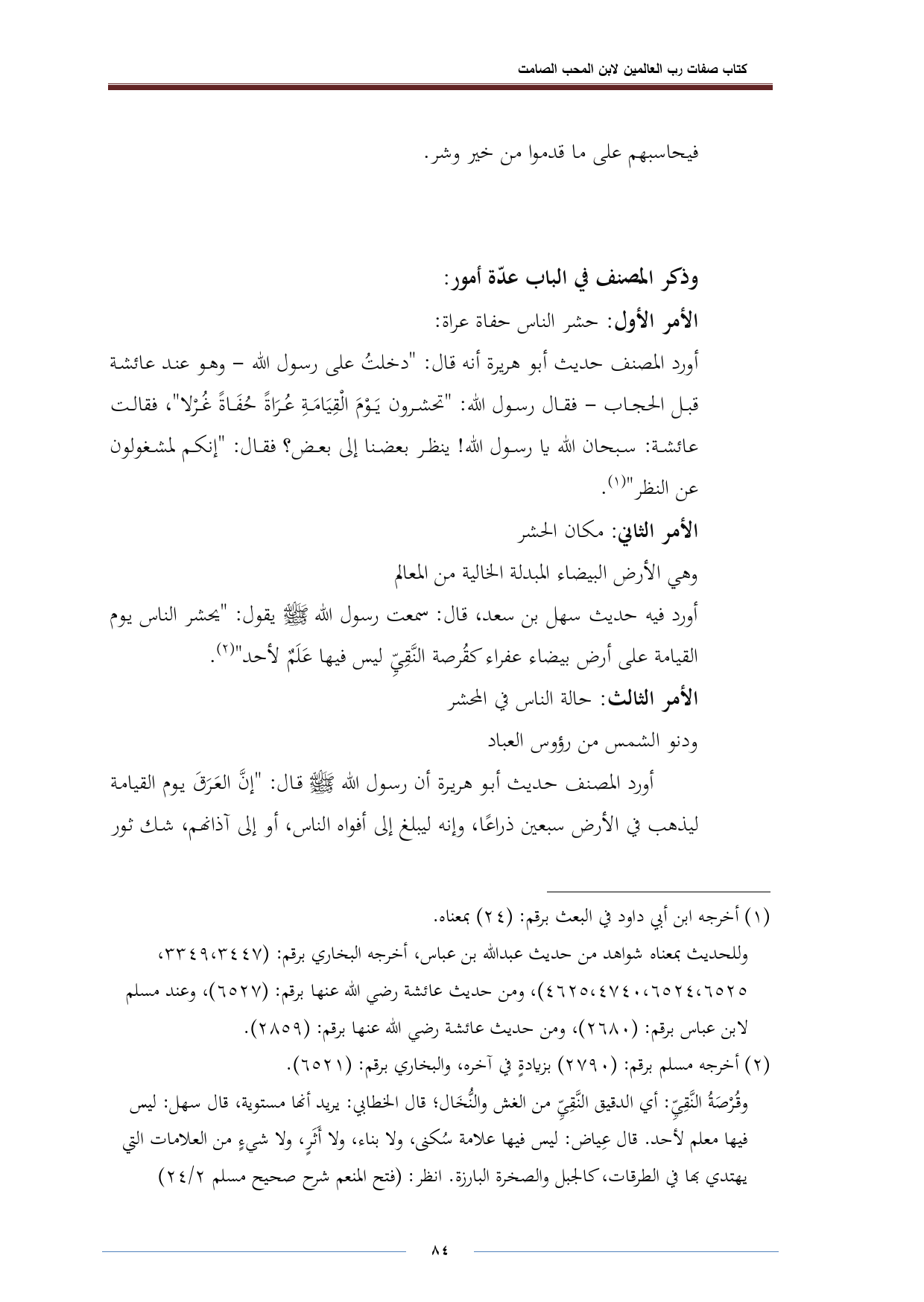 أورد المصنف حديث أبو هريرة أنه قال: "دخلتُ على رسول الله - وهو عند عائشة قبل الحجاب - فقال رسول الله: "تحشرون يَوْمَ الْقِيَامَةِ عُرَاةً حُفَاةً غُرْلا"، فقالت عائشة: سبحان الله يا رسول الله! ينظر بعضنا إلى بعض؟ فقال: "إنكم لمشغولون عن النظر" (¬١).