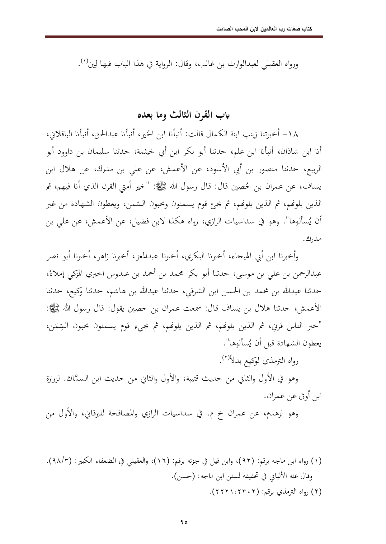 ١٨ - أخبرتنا زينب ابنة الكمال قالت: أنبأنا ابن الخير، أنبأنا عبد الحق، أنبأنا الباقلاني، أنا ابن شاذان، أنبأنا ابن علم، حدثنا أبو بكر ابن أبي خيثمة، حدثنا سليمان بن داوود أبو الربيع، حدثنا منصور بن أبي الأسود، عن الأعمش، عن علي بن مدرك، عن هلال ابن يساف، عن عمران بن حُصين قال: قال رسول الله - صلى الله عليه وسلم -: "خير أمتي القرن الذي أنا فيهم، ثم الذين يلونهم، ثم الذين يلونهم، تم يجيء قوم يسمنون ويحبون السّمن، ويعطون الشهادة من غير أن يُسألوها". وهو في سداسيات الرازي، رواه هكذا لابن فضيل، عن الأعمش، عن علي بن مدرك.