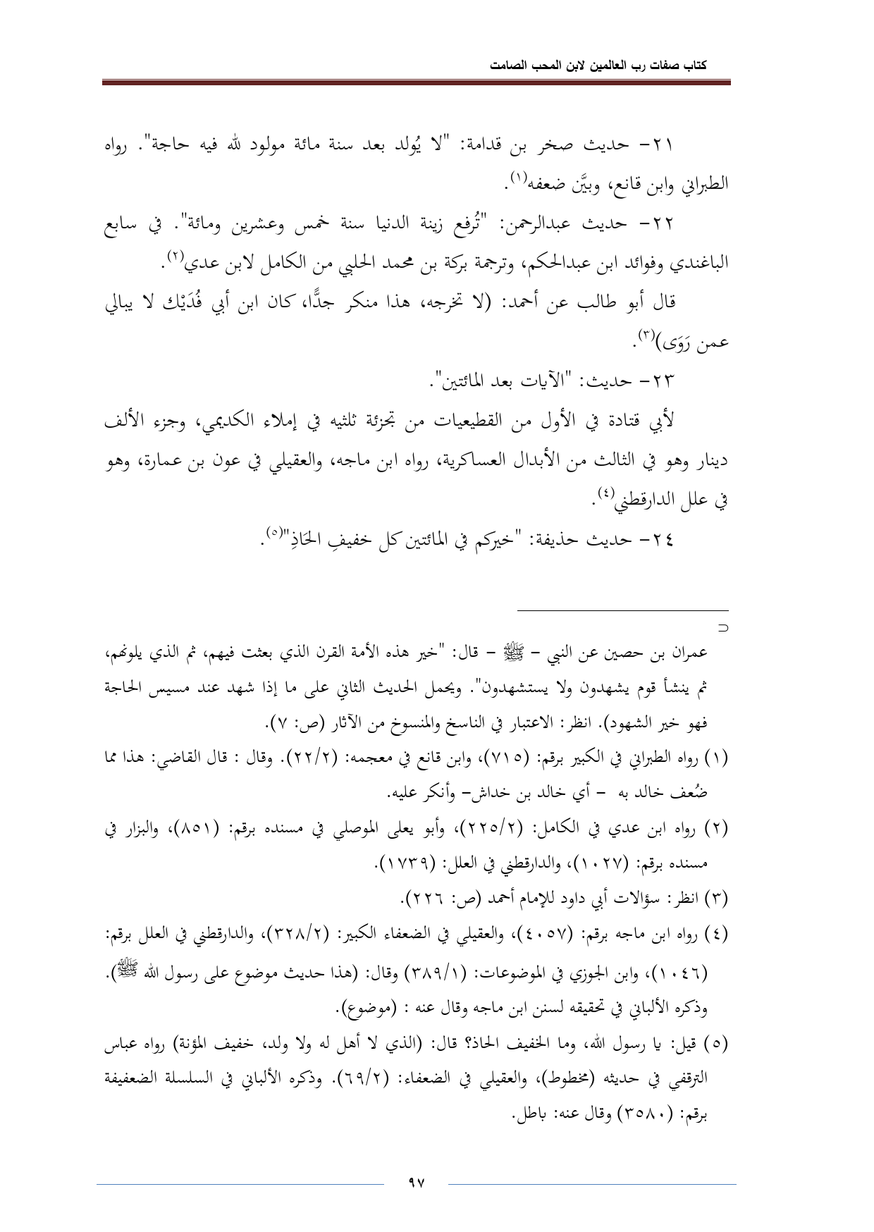٢١ - حديث صخر بن قدامة: "لا يُولد بعد سنة مائة مولود لله فيه حاجة". رواه الطبراني وابن قانع، وبيَّن ضعفه (¬١).