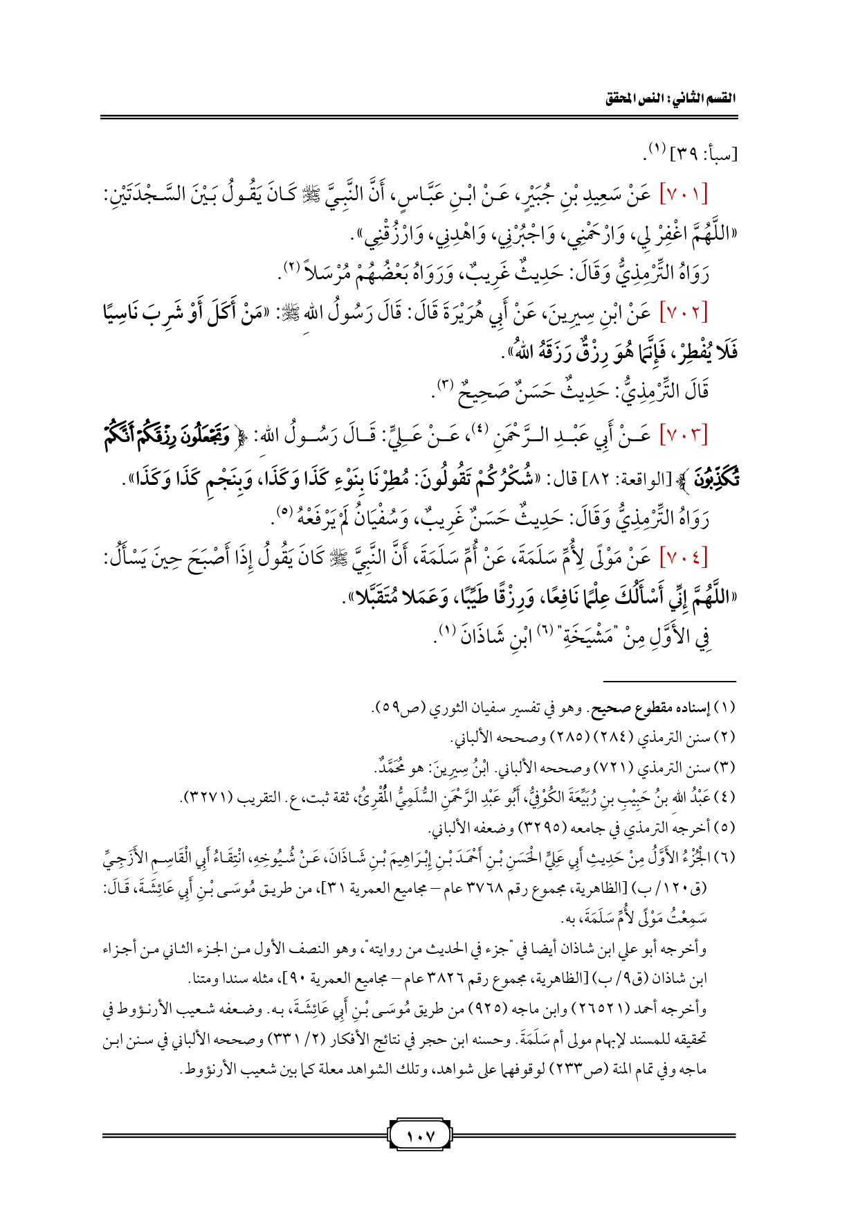[701] عَنْ سَعِيدِ بْنِ جُبَيْرٍ، عَنْ ابْنِ عَبَّاسٍ، أَنَّ النَّبِيَّ - صلى الله عليه وسلم - كَانَ يَقُولُ بَيْنَ السَّجْدَتَيْنِ: «اللَّهُمَّ اغْفِرْ لِي، وَارْحَمْنِي، وَاجْبُرْنِي، وَاهْدِنِي، وَارْزُقْنِي».