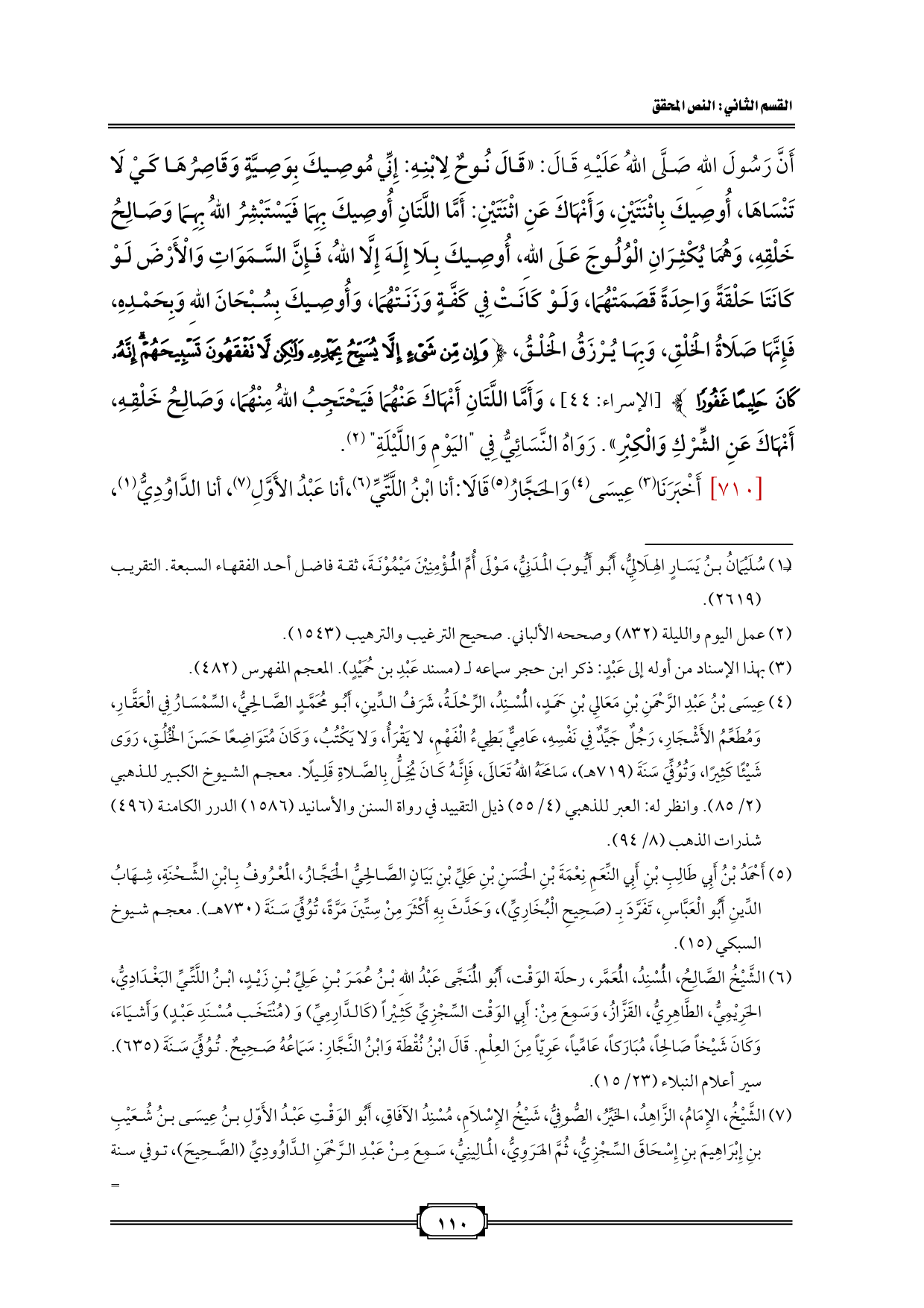 أَنَّ رَسُولَ اللهِ صَلَّى اللهُ عَلَيْهِ قَالَ: «قَالَ نُوحٌ لِابْنِهِ: إِنِّي مُوصِيكَ بِوَصِيَّةٍ وَقَاصِرُهَا كَيْ لَا تَنْسَاهَا، أُوصِيكَ بِاثْنَتَيْنِ، وَأَنْهَاكَ عَنِ اثْنَتَيْنِ: أَمَّا اللَّتَانِ أُوصِيكَ بِهِمَا فَيَسْتَبْشِرُ اللهُ بِهِمَا وَصَالِحُ خَلْقِهِ، وَهُمَا يُكْثِرَانِ الْوُلُوجَ عَلَى اللهِ، أُوصِيكَ بِلَا إِلَهَ إِلَّا اللهُ، فَإِنَّ السَّمَوَاتِ وَالْأَرْضَ لَوْ كَانَتَا حَلْقَةً وَاحِدَةً قَصَمَتْهُمَا، وَلَوْ كَانَتْ فِي كَفَّةٍ وَزَنَتْهُمَا، وَأُوصِيكَ بِسُبْحَانَ اللهِ وَبِحَمْدِهِ، فَإِنَّهَا صَلَاةُ الْخَلْقِ، وَبِهَا يُرْزَقُ الْخَلْقُ، {وَإِنْ مِنْ شَيْءٍ إِلَّا يُسَبِّحُ بِحَمْدِهِ وَلَكِنْ لَا تَفْقَهُونَ تَسْبِيحَهُمْ إِنَّهُ كَانَ حَلِيمًا غَفُورًا} [الإسراء: 44]، وَأَمَّا اللَّتَانِ أَنْهَاكَ عَنْهُمَا فَيَحْتَجِبُ اللهُ مِنْهُمَا، وَصَالِحُ خَلْقِهِ، أَنْهَاكَ عَنِ الشِّرْكِ وَالْكِبْرِ». رَوَاهُ النَّسَائِيُّ فِي "اليَوْمِ وَاللَّيْلَةِ" (¬1).