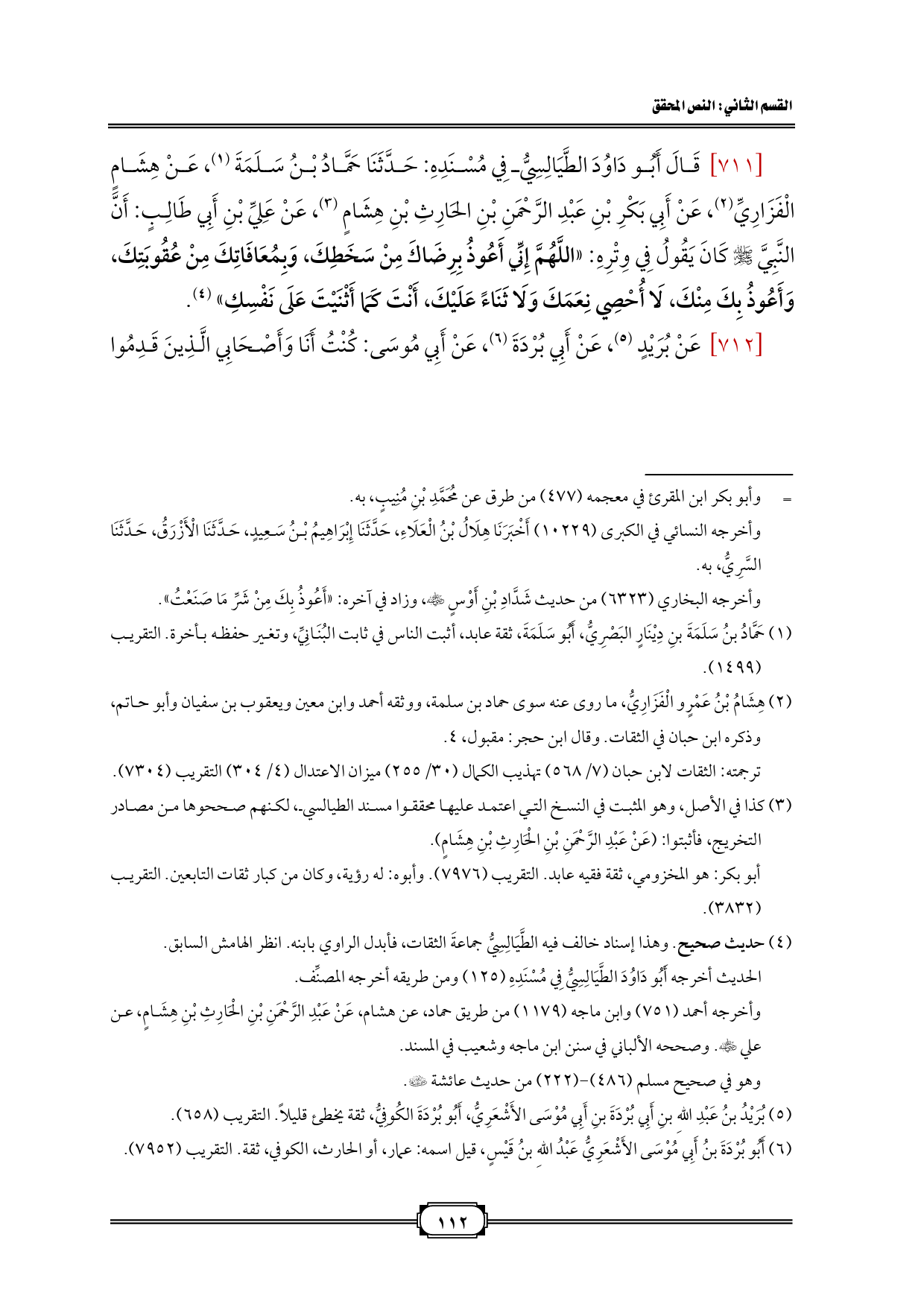 [711] قَالَ أَبُو دَاوُدَ الطَّيَالِسِيُّ فِي مُسْنَدِهِ: حَدَّثَنَا حَمَّادُ بْنُ سَلَمَةَ (¬1)، عَنْ هِشَامٍ الْفَزَارِيِّ (¬2)، عَنْ أَبِي بَكْرِ بْنِ عَبْدِ الرَّحْمَنِ بْنِ الحَارِثِ بْنِ هِشَامٍ (¬3)، عَنْ عَلِيِّ بْنِ أَبِي طَالِبٍ: أَنَّ النَّبِيَّ - صلى الله عليه وسلم - كَانَ يَقُولُ فِي وِتْرِهِ: «اللَّهُمَّ إِنِّي أَعُوذُ بِرِضَاكَ مِنْ سَخَطِكَ، وَبِمُعَافَاتِكَ مِنْ عُقُوبَتِكَ، وَأَعُوذُ بِكَ مِنْكَ، لَا أُحْصِي نِعَمَكَ وَلَا ثَنَاءً عَلَيْكَ، أَنْتَ كَمَا أَثْنَيْتَ عَلَى نَفْسِكِ» (¬4).