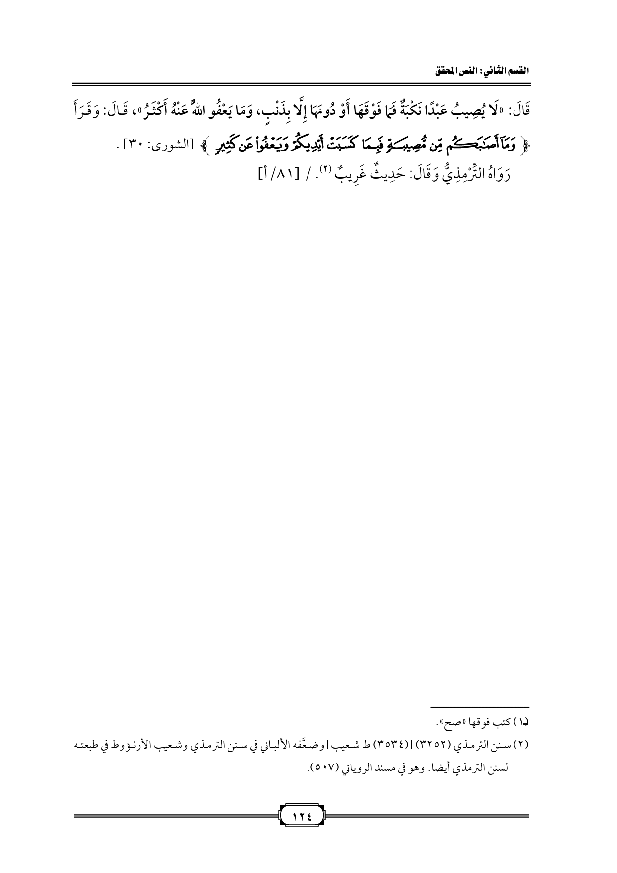 قَالَ: «لَا يُصِيبُ عَبْدًا نَكْبَةٌ فَمَا فَوْقَهَا أَوْ دُونَهَا إِلَّا بِذَنْبٍ، وَمَا يَعْفُو اللَّهُ عَنْهُ أَكْثَرُ»، قَالَ: وَقَرَأَ {وَمَا أَصَابَكُمْ مِنْ مُصِيبَةٍ فَبِمَا كَسَبَتْ أَيْدِيكُمْ وَيَعْفُو عَنْ كَثِيرٍ} [الشورى: 30].