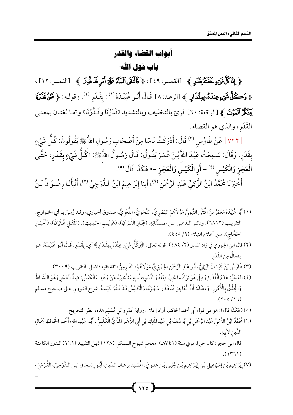 [733] عَنْ طَاوُسٍ (¬3) قَالَ: أَدْرَكْتُ نَاسًا مِنْ أَصْحَابِ رَسُولِ اللَّهِ - صلى الله عليه وسلم - يَقُولُونَ: كُلُّ شَيْءٍ بِقَدَرٍ. وَقَالَ: سَمِعْتُ عَبْدَ اللَّهِ بْنَ عُمَرَ يَقُولُ: قَالَ رَسُولُ اللَّهِ - صلى الله عليه وسلم -: «كُلُّ شَيْءٍ بِقَدَرٍ، حَتَّى الْعَجْزِ وَالْكَيْسِ (¬4) - أَوِ الْكَيْسِ وَالْعَجْزِ -» هَكَذَا قَالَ (¬5).