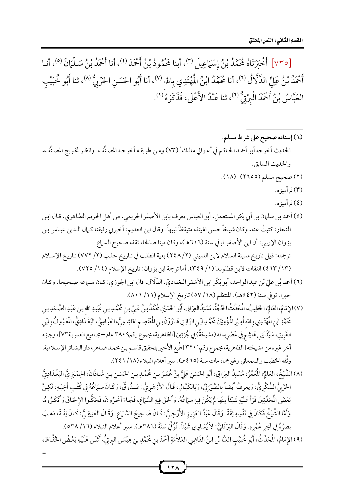 [735] أَخْبَرَنَاهُ مُحَمَّدُ بْنُ إِسْمَاعِيلَ (¬1)، أبنا مَحْمُودُ بْنُ أَحْمَدَ (¬2)، أنا أَحْمَدُ بْنُ سَلْمَانَ (¬3)، أنا أَحْمَدُ بْنُ عَلِيٍّ الدَّلَّالُ (¬4)، أنا مُحَمَّدُ ابْنُ الْمُهْتَدِي بِاللهِ (¬5)، أنا أَبُو الحَسَنِ الحَرْبِيُّ (¬6)، ثنا أَبُو خُبَيْبٍ العَبَّاسُ بْنُ أَحْمَدَ الْبِرْتِيُّ (¬7)، ثنا عَبْدُ الأَعْلَى، فَذَكَرَهُ (¬8).