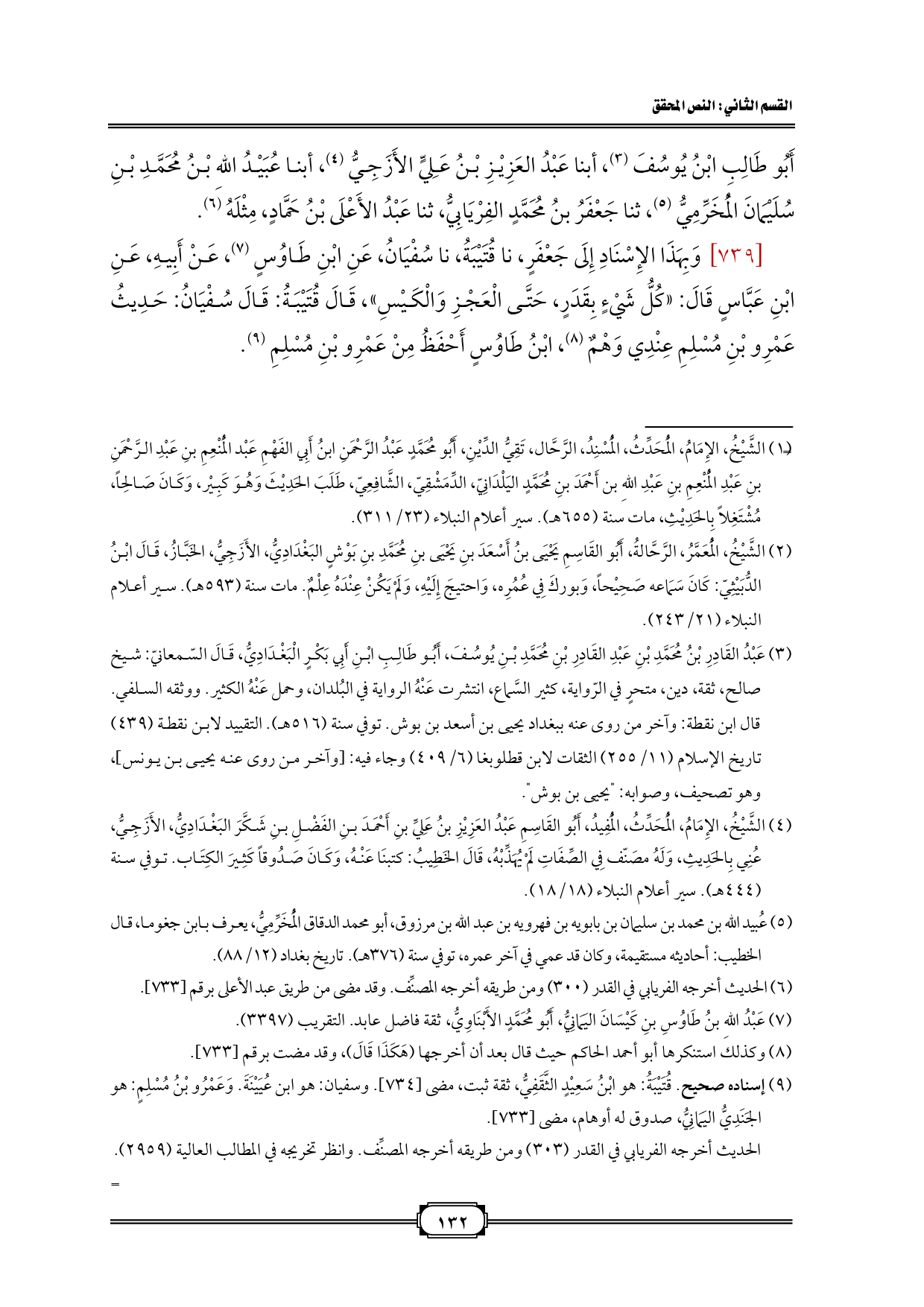 [739] وَبِهَذَا الإِسْنَادِ إِلَى جَعْفَرٍ، نا قُتَيْبَةُ، نا سُفْيَانُ، عَنِ ابْنِ طَاوُسٍ (¬5)، عَنْ أَبِيهِ، عَنِ ابْنِ عَبَّاسٍ قَالَ: «كُلُّ شَيْءٍ بِقَدَرٍ، حَتَّى الْعَجْزِ وَالْكَيْسِ»، قَالَ قُتَيْبَةُ: قَالَ سُفْيَانُ: حَدِيثُ عَمْرِو بْنِ مُسْلِمِ عِنْدِي وَهْمٌ (¬6)، ابْنُ طَاوُسٍ أَحْفَظُ مِنْ عَمْرِو بْنِ مُسْلِمِ (¬7).