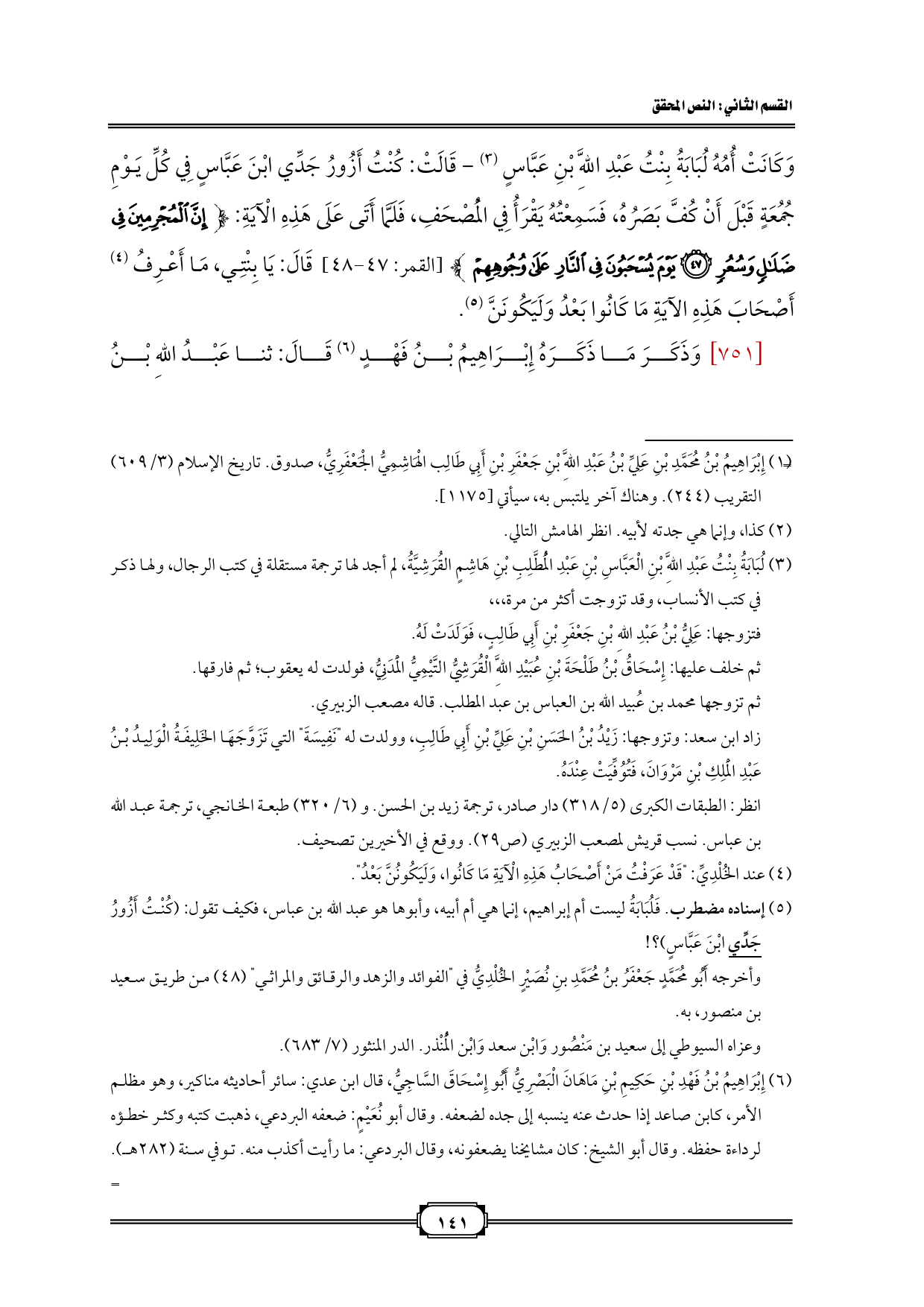 (¬3) إسناده مضطرب. فَلُبَابَةُ ليست أم إبراهيم، إنما هي أم أبيه، وأبوها هو عبد الله بن عباس، فكيف تقول: (كُنْتُ أَزُورُ جَدِّي ابْنَ عَبَّاسٍ)؟ !