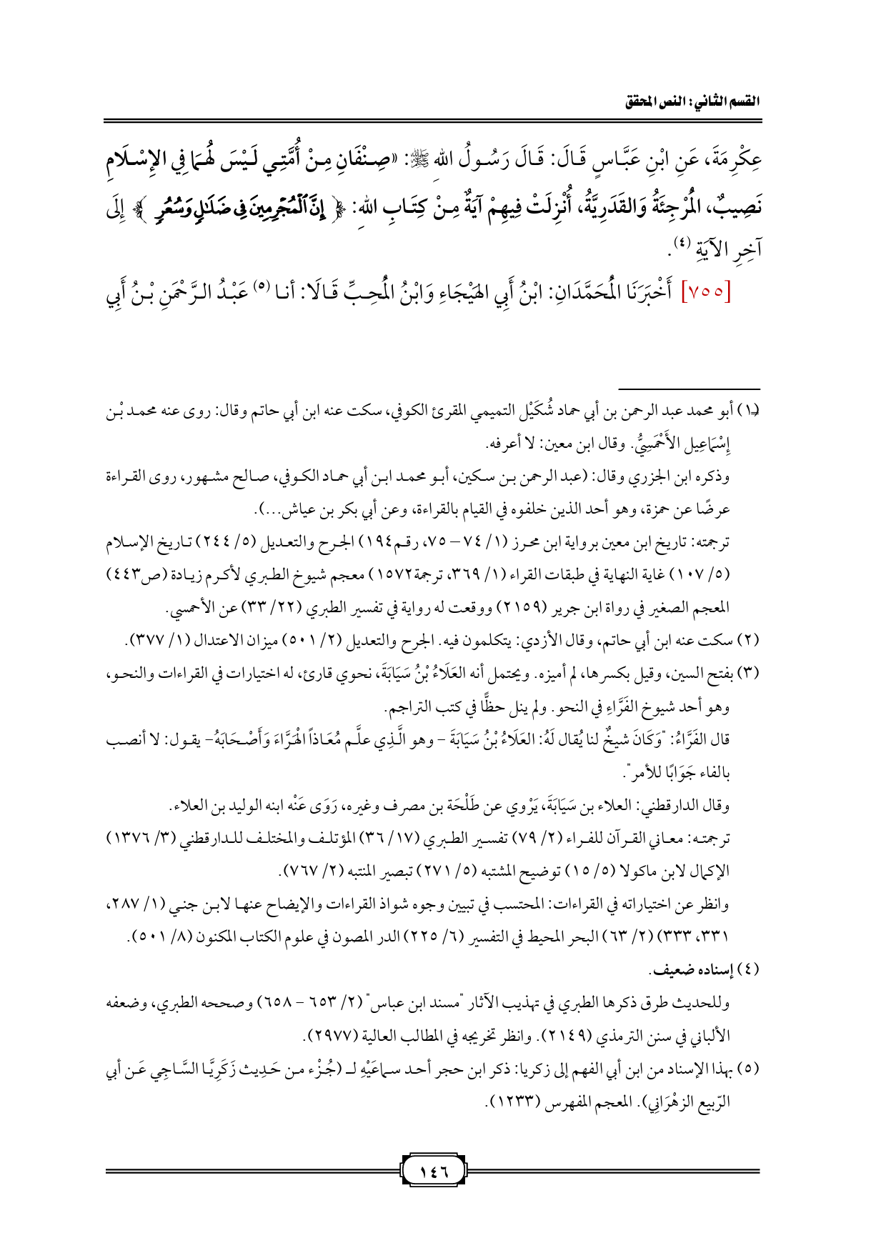 عِكْرِمَةَ، عَنِ ابْنِ عَبَّاسٍ قَالَ: قَالَ رَسُولُ اللهِ - صلى الله عليه وسلم -: «صِنْفَانِ مِنْ أُمَّتِي لَيْسَ لَهُمَا فِي الإِسْلَامِ نَصِيبٌ، الْمُرْجِئَةُ وَالقَدَرِيَّةُ، أُنْزِلَتْ فِيهِمْ آيَةٌ مِنْ كِتَابِ اللهِ: {إِنَّ الْمُجْرِمِينَ فِي ضَلَالٍ وَسُعُرٍ} إِلَى آخِرِ الآيَةِ (¬1).