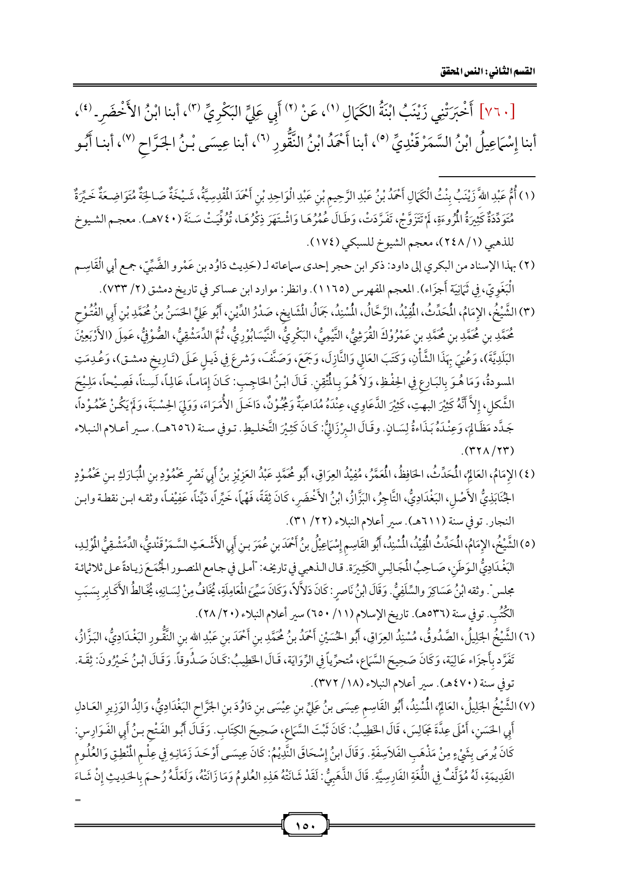 [760] أَخْبَرَتْنِي زَيْنَبُ ابْنَةُ الكَمَالِ (¬1)، عَنْ (¬2) أَبِي عَلِيٍّ البَكْرِيِّ (¬3)، أبنا ابْنُ الأَخْضَرِ (¬4)، أبنا إِسْمَاعِيلُ ابْنُ السَّمَرْقَنْدِيِّ (¬5)، أبنا أَحْمَدُ ابْنُ النَّقُّورِ (¬6)، أبنا عِيسَى بْنُ الجَرَّاحِ (¬7)، أبنا أَبُو