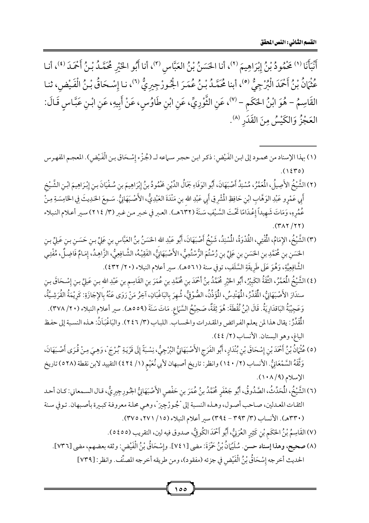 أَنْبَأَنَا (¬1) مَحْمُودُ بْنُ إِبْرَاهِيمَ (¬2)، أنا الحَسَنُ بْنُ العَبَّاسِ (¬3)، أنا أَبُو الخَيْرِ مُحَمَّدُ بْنُ أَحْمَدَ (¬4)، أنا عُثْمَانُ بْنُ أَحْمَدَ الْبُرْجِيُّ (¬5)، أبنا مُحَمَّدُ بْنُ عُمَرَ الْجُورْجِيرِيُّ (¬6)، نا إِسْحَاقُ بْنُ الْفَيْضِ، ثنا القَاسِمُ - هُوَ ابْنُ الحَكَمِ - (¬7)، عَنِ الثَّوْرِيِّ، عَنِ ابْنِ طَاوُسٍ، عَنْ أَبِيهِ، عَنِ ابْنِ عَبَّاسٍ قَالَ: العَجْزُ وَالكَيْسُ مِنَ القَدَرِ (¬8).