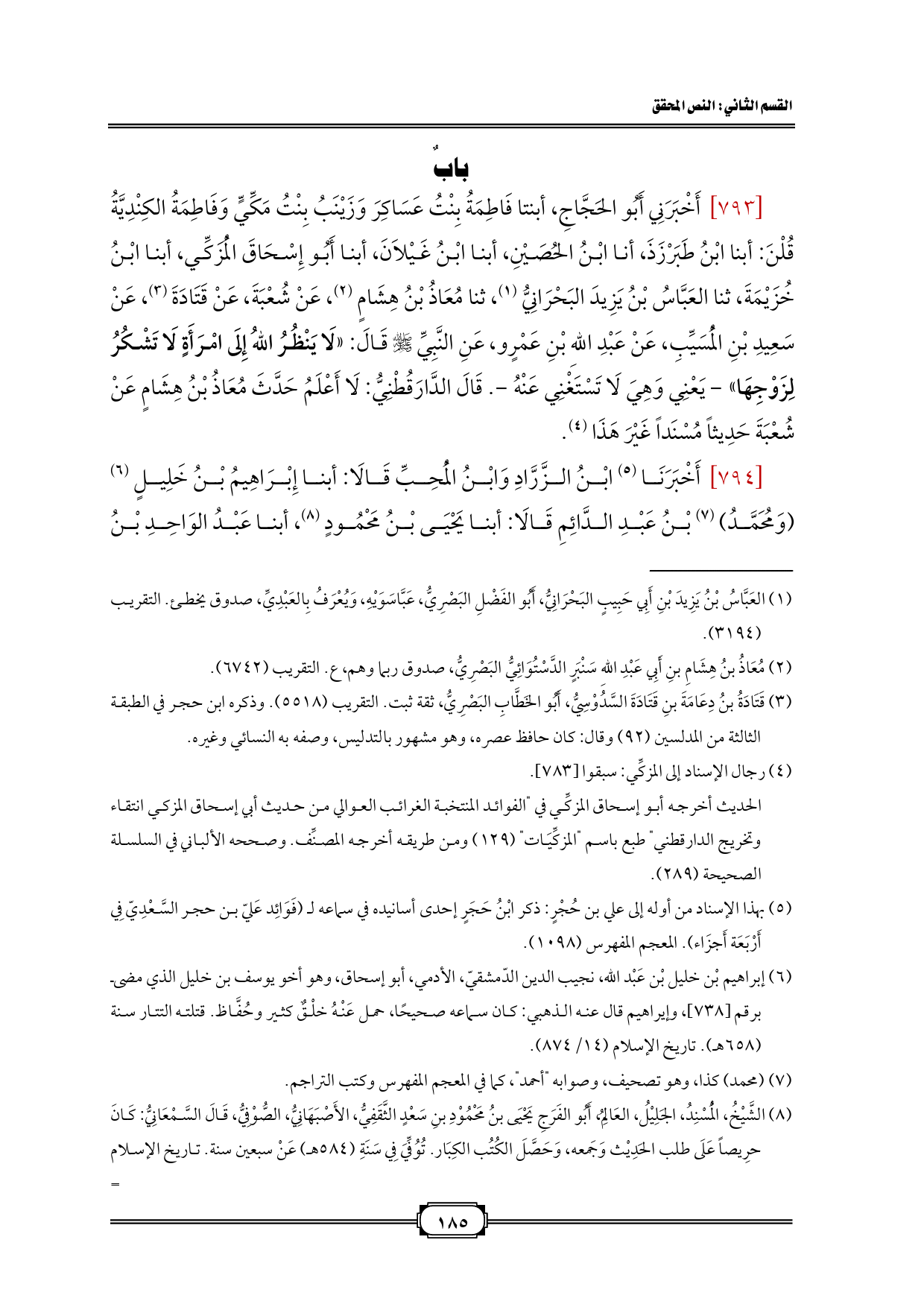 [793] أَخْبَرَنِي أَبُو الحَجَّاجِ، أبنتا فَاطِمَةُ بِنْتُ عَسَاكِرَ وَزَيْنَبُ بِنْتُ مَكِّيٍّ وَفَاطِمَةُ الكِنْدِيَّةُ قُلْنَ: أبنا ابْنُ طَبَرْزَذَ، أنا ابْنُ الحُصَيْنِ، أبنا ابْنُ غَيْلاَنَ، أبنا أَبُو إِسْحَاقَ الْمُزَكِّي، أبنا ابْنُ خُزَيْمَةَ، ثنا العَبَّاسُ بْنُ يَزِيدَ البَحْرَانِيُّ (¬1)، ثنا مُعَاذُ بْنُ هِشَامٍ (¬2)، عَنْ شُعْبَةَ، عَنْ قَتَادَةَ (¬3)، عَنْ سَعِيدِ بْنِ الْمُسَيِّبِ، عَنْ عَبْدِ اللهِ بْنِ عَمْرٍو، عَنِ النَّبِيِّ - صلى الله عليه وسلم - قَالَ: «لَا يَنْظُرُ اللهُ إِلَى امْرَأَةٍ لَا تَشْكُرُ لِزَوْجِهَا» - يَعْنِي وَهِيَ لَا تَسْتَغْنِي عَنْهُ -. قَالَ الدَّارَقُطْنِيُّ: لَا أَعْلَمُ حَدَّثَ مُعَاذُ بْنُ هِشَامٍ عَنْ شُعْبَةَ حَدِيثاً مُسْنَداً غَيْرَ هَذَا (¬4).