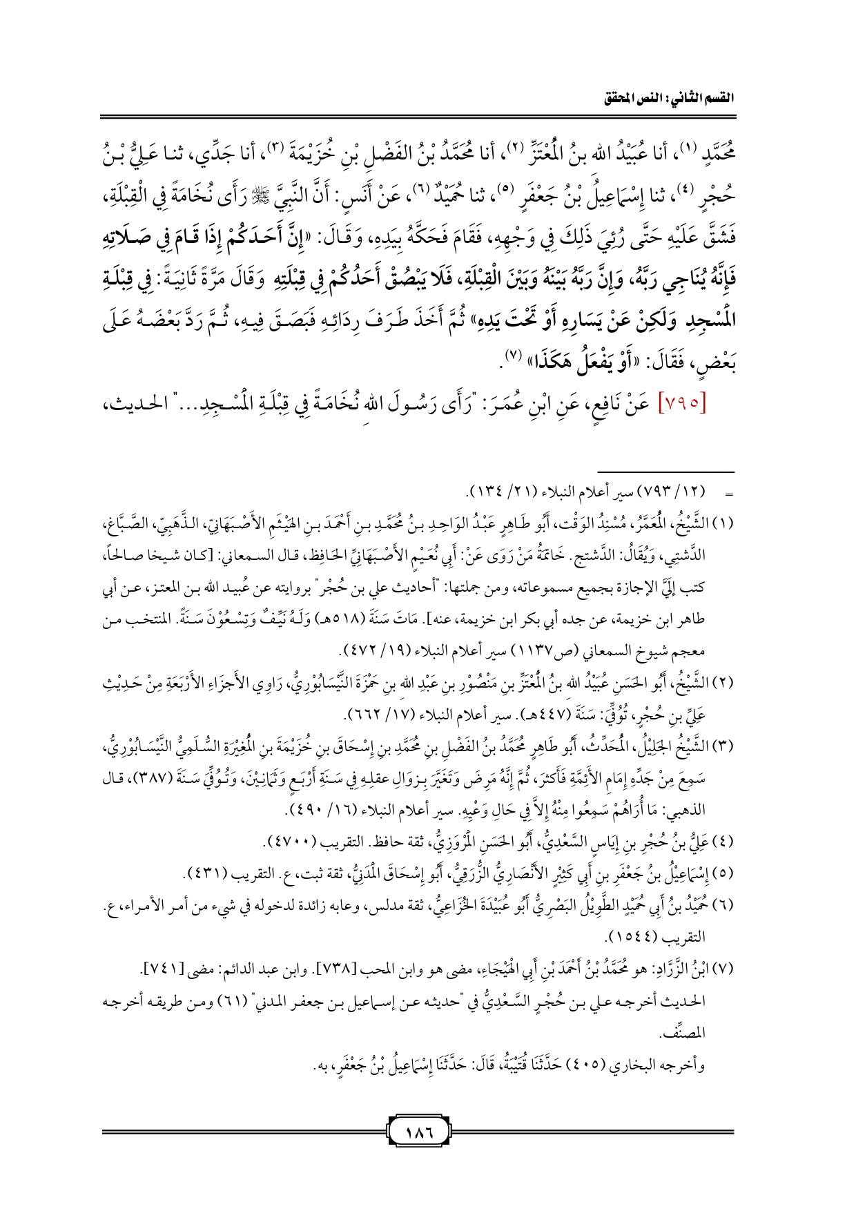 مُحَمَّدٍ (¬1)، أنا عُبَيْدُ اللهِ بنُ الْمُعْتَزِّ (¬2)، أنا مُحَمَّدُ بْنُ الفَضْلِ بْنِ خُزَيْمَةَ (¬3)، أنا جَدِّي، ثنا عَلِيُّ بْنُ حُجْرٍ (¬4)، ثنا إِسْمَاعِيلُ بْنُ جَعْفَرٍ (¬5)، ثنا حُمَيْدٌ (¬6)، عَنْ أَنَسٍ: أَنَّ النَّبِيَّ - صلى الله عليه وسلم - رَأَى نُخَامَةً فِي الْقِبْلَةِ، فَشَقَّ عَلَيْهِ حَتَّى رُئِيَ ذَلِكَ فِي وَجْهِهِ، فَقَامَ فَحَكَّهُ بِيَدِهِ، وَقَالَ: «إِنَّ أَحَدَكُمْ إِذَا قَامَ فِي صَلَاتِهِ فَإِنَّهُ يُنَاجِي رَبَّهُ، وَإِنَّ رَبَّهُ بَيْنَهُ وَبَيْنَ الْقِبْلَةِ، فَلَا يَبْصُقْ أَحَدُكُمْ فِي قِبْلَتِهِ وَقَالَ مَرَّةً ثَانِيَةً: فِي قِبْلَةِ الْمَسْجِدِ وَلَكِنْ عَنْ يَسَارِهِ أَوْ تَحْتَ يَدِهِ» ثُمَّ أَخَذَ طَرَفَ رِدَائِهِ فَبَصَقَ فِيهِ، ثُمَّ رَدَّ بَعْضَهُ عَلَى بَعْضٍ، فَقَالَ: «أَوْ يَفْعَلُ هَكَذَا» (¬7).