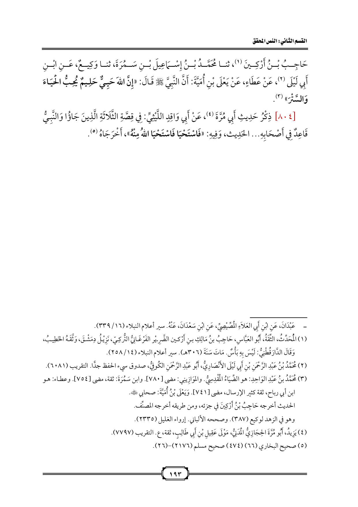 حَاجِبُ بْنُ أَرْكِينَ (¬1)، ثنا مُحَمَّدُ بْنُ إِسْمَاعِيلَ بْنِ سَمُرَةَ، ثنا وَكِيعٌ، عَنِ ابْنِ أَبِي لَيْلَى (¬2)، عَنْ عَطَاءٍ، عَنْ يَعْلَى بْنِ أُمَيَّةَ: أَنَّ النَّبِيَّ - صلى الله عليه وسلم - قَالَ: «إِنَّ اللهَ حَيِيٌّ حَلِيمٌ يُحِبُّ الْحَيَاءَ وَالسَّتْرَ» (¬3).