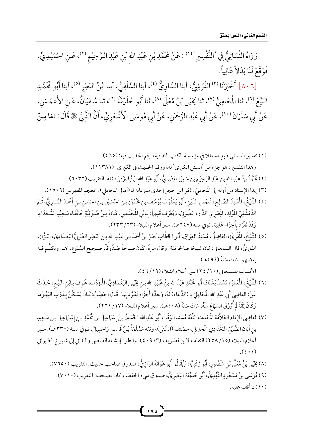 (¬7) القَاضِي الإِمَام العَلاَّمَة الْمُحَدِّث الثِّقَة مُسْند الوَقْت أَبُو عَبْدِ اللهِ الحُسَيْنُ بنُ إِسْمَاعِيلَ بن مُحَمَّدِ بنِ إِسْمَاعِيلَ بن سَعِيدِ بنِ أبَان الضَّبِّيّ البَغْدَادِيّ الْمَحَامِلِيّ، مصَنّف (السُّنَن)، وثقه مَسْلَمَةُ بْنُ قَاسِمٍ وَالخَلِيلِيُّ، توفي سنة (330 هـ). سير أعلام النبلاء (15/ 258) الثقات لابن قطلوبغا (3/ 409). وانظر: إرشاد القاصي والداني إلى شيوخ الطبراني (401).