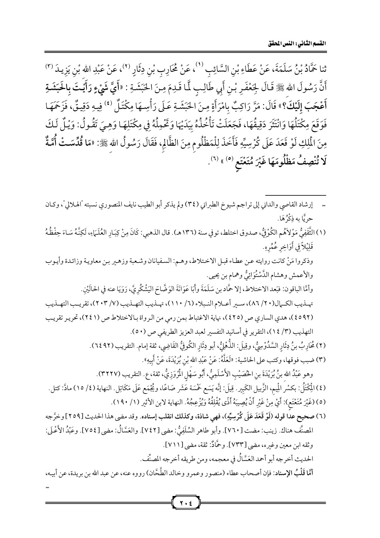 ثنا حَمَّادُ بْنُ سَلَمَةَ، عَنْ عَطَاءِ بْنِ السَّائِبِ (¬1)، عَنْ مُحَارِبِ بْنِ دِثَارٍ (¬2)، عَنْ عَبْدِ اللهِ بْنِ يَزِيدَ (¬3) أَنَّ رَسُولَ اللهِ - صلى الله عليه وسلم - قَالَ لِجَعْفَرِ بْنِ أَبِي طَالِبٍ لَمَّا قَدِمَ مِنَ الحَبَشَةِ: «أَيَّ شَيْءٍ رَأَيْتَ بِالحَبَشَةِ أَعْجَبَ إِلَيْكَ؟ » قَالَ: مَرَّ رَاكِبٌ بِامْرَأَةٍ مِنَ الحَبَشَةِ عَلَى رَأْسِهَا مِكْتَلٌ (¬4) فِيهِ دَقِيقٌ، فَزَحَمَهَا فَوَقَعَ مِكْتَلُهَا وَانْتَثَرَ دَقِيقُهَا، فَجَعَلَتْ تَأْخُذُهُ بِيَدَيْهَا وَتَحْمِلُهُ فِي مِكْتَلِهَا وَهِيَ تَقُولُ: وَيْلٌ لَكَ مِنَ الْمَلِكِ لَوْ قَعَدَ عَلَى كُرْسِيِّهِ فَأَخَذَ لِلْمَظْلُومِ مِنَ الظَّالِمِ، فَقَالَ رَسُولُ اللهِ - صلى الله عليه وسلم -: «مَا قُدِّسَتْ أُمَّةٌ لَا تُنْصِفُ مَظْلُومَهَا غَيْرَ مُتَعْتَعٍ (¬5)» (¬6).