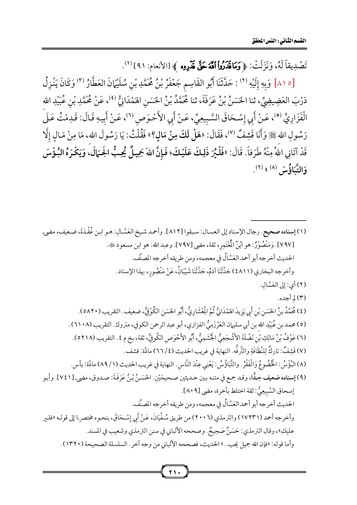 [815] وَبِهِ إِلَيْهِ (¬2): حَدَّثَنَا أَبُو القَاسِمِ جَعْفَرُ بْنُ مُحَمَّدِ بْنِ سُلَيْمَانَ العَطَّارُ (¬3) وَكَانَ يَنْزِلُ دَرْبَ العَضِيضِيِّ، ثنا الحَسَنُ بْنُ عَرَفَةَ، ثنا مُحَمَّدُ بْنُ الحَسَنِ الهَمْدَانِيُّ (¬4)، عَنْ مُحَمَّدِ بْنِ عُبَيْدِ اللهِ الْفَزَارِيِّ (¬5)، عَنْ أَبِي إِسْحَاقَ السَّبِيعِيِّ، عَنْ أَبِي الأَحْوَصِ (¬6)، عَنْ أَبِيهِ قَالَ: قَدِمْتُ عَلَى رَسُولِ اللهِ - صلى الله عليه وسلم - وَأَنَا قَشِفٌ (¬7)، فَقَالَ: «هَلْ لَكَ مِنْ مَالٍ؟ » فَقُلْتُ: يَا رَسُولَ اللهِ، مَا مِنْ مَالٍ إِلَّا قَدْ آتَانِي اللهُ مِنْهُ طَرَفاً. قَالَ: «فَلْيُرَ ذَلِكَ عَلَيْكَ؛ فَإِنَّ اللهَ جَمِيلٌ يُحِبُّ الجَمَالَ، وَيَكْرَهُ البُؤْسَ وَالتَّبَاؤُسَ (¬8)» (¬9).