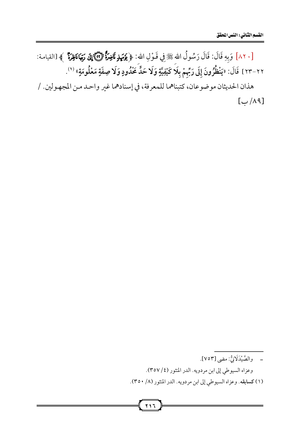 [820] وَبِهِ قَالَ: قَالَ رَسُولُ اللهِ - صلى الله عليه وسلم - فِي قَوْلِ اللهِ: {نَاضِرَةٌ (22) إِلَى رَبِّهَا نَاظِرَةٌ} [القيامة: 22 - 23] قَالَ: «يَنْظُرُونَ إِلَى رَبِّهِمْ بِلَا كَيْفِيَّةٍ وَلَا حَدٍّ مَحْدُودٍ وَلَا صِفَةٍ مَعْلُومَةٍ» (¬1).