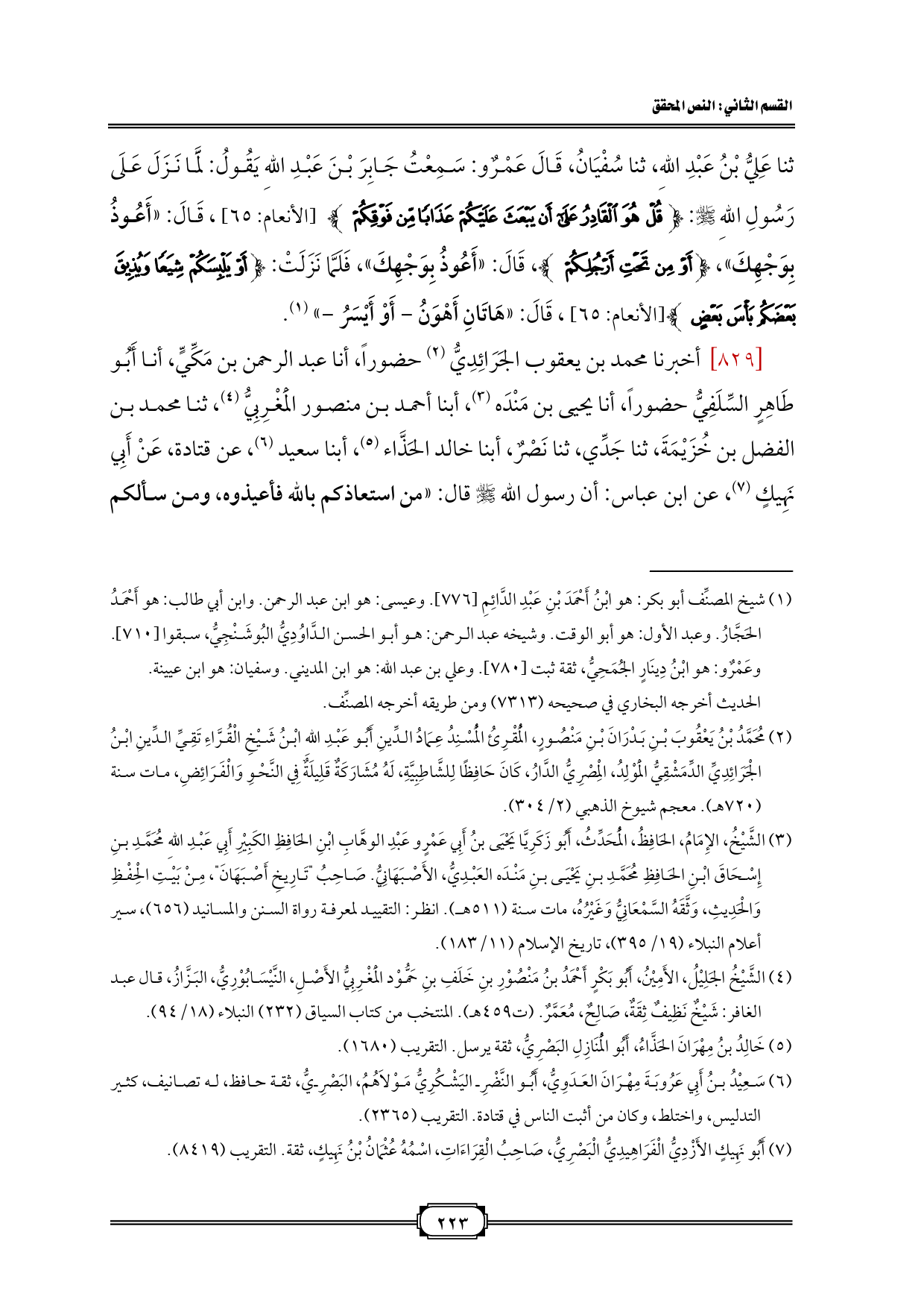 ثنا عَلِيُّ بْنُ عَبْدِ اللهِ، ثنا سُفْيَانُ، قَالَ عَمْرٌو: سَمِعْتُ جَابِرَ بْنَ عَبْدِ اللهِ يَقُولُ: لَمَّا نَزَلَ عَلَى رَسُولِ اللهِ - صلى الله عليه وسلم -: {قُلْ هُوَ الْقَادِرُ عَلَى أَنْ يَبْعَثَ عَلَيْكُمْ عَذَابًا مِنْ فَوْقِكُمْ} [الأنعام: 65]، قَالَ: «أَعُوذُ بِوَجْهِكَ»، {أَوْ مِنْ تَحْتِ أَرْجُلِكُمْ}، قَالَ: «أَعُوذُ بِوَجْهِكَ»، فَلَمَّا نَزَلَتْ: {أَوْ يَلْبِسَكُمْ شِيَعًا وَيُذِيقَ بَعْضَكُمْ بَأْسَ بَعْضٍ} [الأنعام: 65]، قَالَ: «هَاتَانِ أَهْوَنُ - أَوْ أَيْسَرُ -» (¬1).