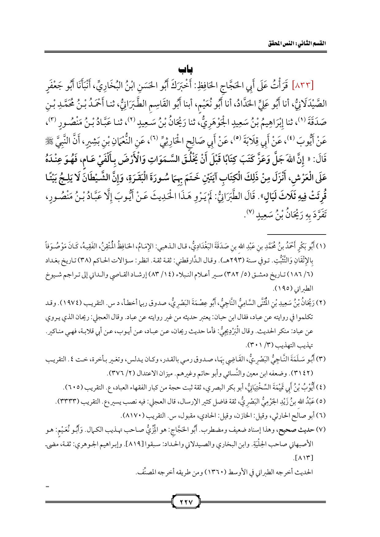 [833] قَرَأْتُ عَلَى أَبِي الحَجَّاجِ الحَافِظِ: أَخْبَرَكَ أَبُو الحَسَنِ ابْنُ البُخَارِيِّ، أَنْبَأَنَا أَبُو جَعْفَرٍ الصَّيْدَلَانِيُّ، أنا أَبُو عَلِيٍّ الحَدَّادُ، أنا أَبُو نُعَيْمٍ، أبنا أَبُو القَاسِمِ الطَّبَرَانِيُّ، ثنا أَحْمَدُ بْنُ مُحَمَّدِ بْنِ صَدَقَةَ (¬1)، ثنا إِبْرَاهِيمُ بْنُ سَعِيدٍ الْجَوْهَرِيُّ، ثنا رَيْحَانُ بْنُ سَعِيدٍ (¬2)، ثنا عَبَّادُ بْنُ مَنْصُورٍ (¬3)، عَنْ أَيُّوبَ (¬4)، عَنْ أَبِي قِلَابَةَ (¬5)، عَنْ أَبِي صَالِحٍ الْحَارِثِيِّ (¬6)، عَنِ النُّعْمَانِ بْنِ بَشِيرٍ، أَنَّ النَّبِيَّ - صلى الله عليه وسلم - قَالَ: «إِنَّ اللهَ جَلَّ وَعَزَّ كَتَبَ كِتَابًا قَبْلَ أَنْ يَخْلُقَ السَّمَوَاتِ وَالْأَرْضَ بِأَلْفَيْ عَامٍ، فَهُوَ عِنْدَهُ عَلَى الْعَرْشِ، أَنْزَلَ مِنْ ذَلِكَ الْكِتَابِ آيَتَيْنِ خَتَمَ بِهِمَا سُورَةَ الْبَقَرَةِ، وَإِنَّ الشَّيْطَانَ لَا يَلِجُ بَيْتًا قُرِئَتْ فِيهِ ثَلَاثَ لَيَالٍ». قَالَ الطَّبَرَانِيُّ: لَمْ يَرْوِ هَذَا الْحَدِيثَ عَنْ أَيُّوبَ إِلَّا عَبَّادُ بْنُ مَنْصُورٍ، تَفَرَّدَ بِهِ رَيْحَانُ بْنُ سَعِيدٍ (¬7).